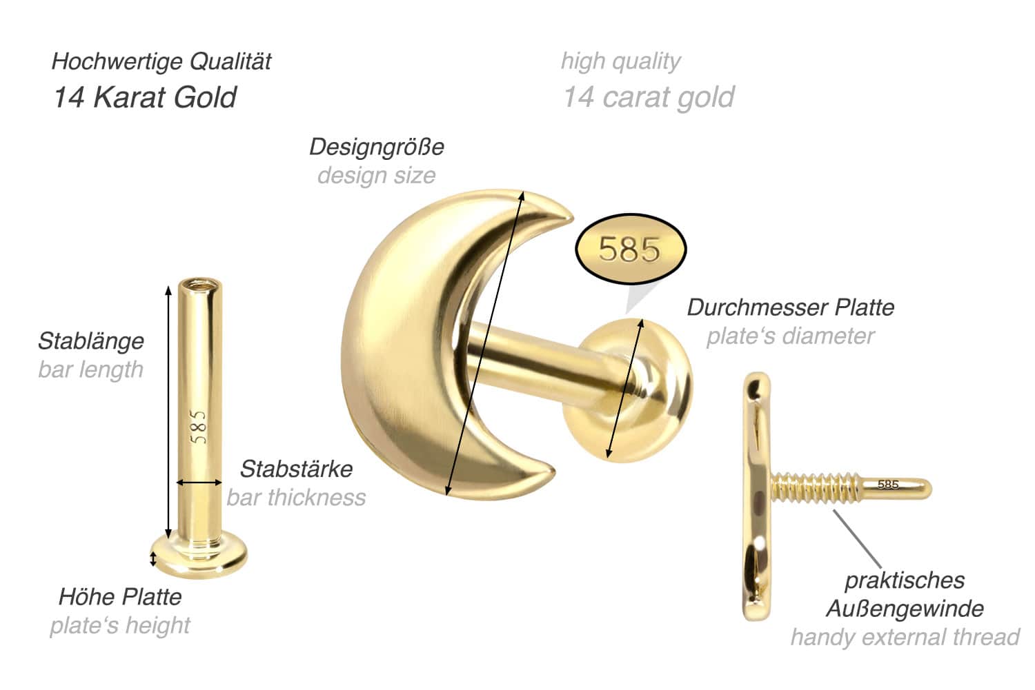 This labret is made entirely of high quality 14 carat (585) gold, which in addition to its excellent quality also knows how to impress with properties such as good skin compatibility and high durability. Color-wise, it is available in yellow gold, rose gold and rhodium-plated white gold. The labret is supplied with a timelessly beautiful screw-in attachment with external thread in form of a moon, has a bar thickness of either 1 or 1.2 mm and is available with the bar lengths listed below. Each and every one of our gold items is handcrafted with great attention to detail, making it one of a kind. Since the 0.8 mm internal thread of the labret is compatible with all our gold products with this kind of external thread, there are various combination possibilities.