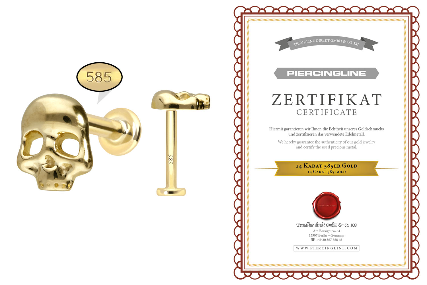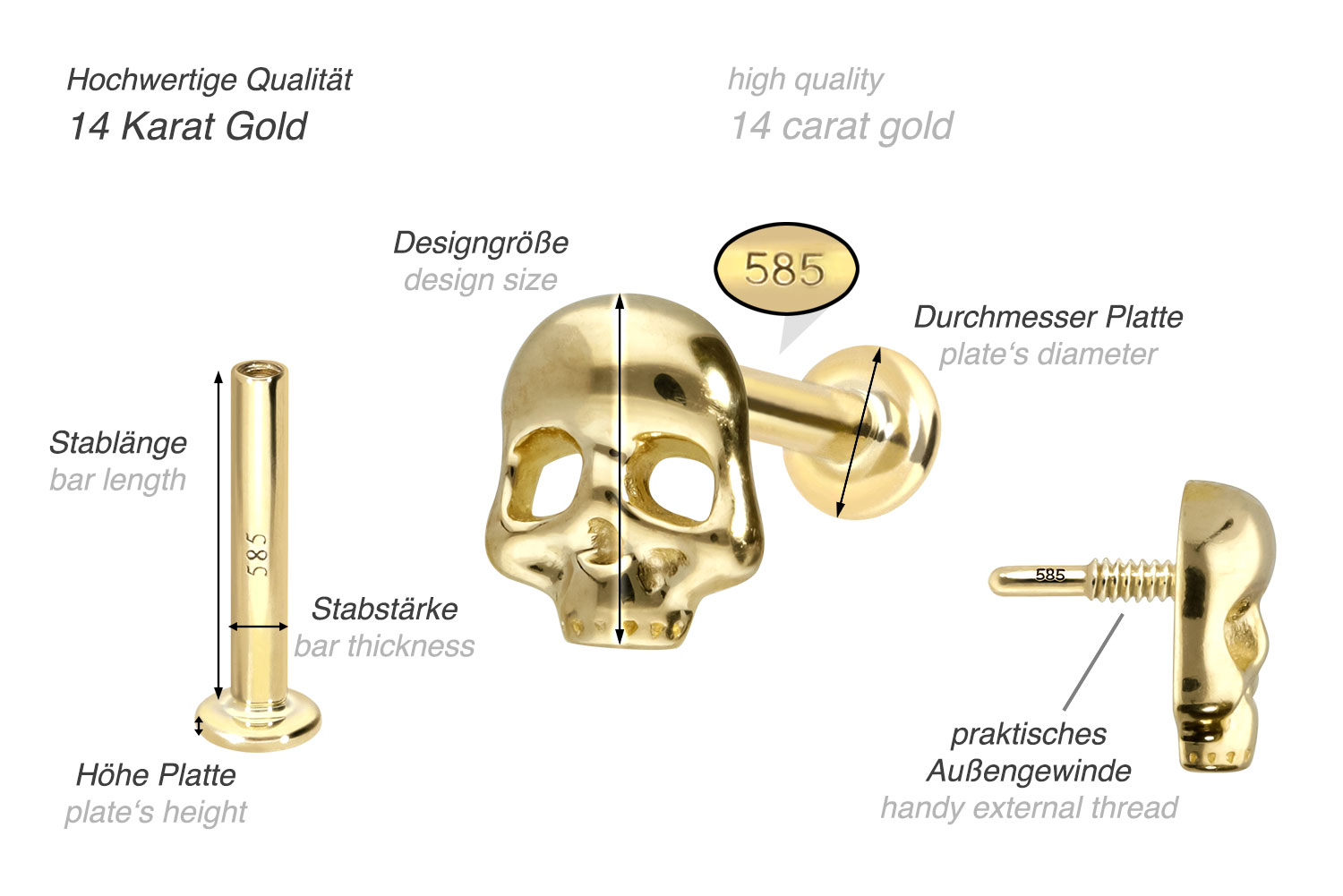 This labret is made entirely of high quality 14 carat (585) gold, which in addition to its excellent quality also knows how to impress with properties such as good skin compatibility and high durability. Color-wise, it is available in yellow gold, rose gold and rhodium-plated white gold. The labret is supplied with a timelessly beautiful screw-in attachment with external thread in form of a skull, has a bar thickness of either 1 or 1.2 mm and is available with the bar lengths listed below. Each and every one of our gold items is handcrafted with great attention to detail, making it one of a kind. Since the 0.8 mm internal thread of the labret is compatible with all our 14 carat (585) gold products with this kind of external thread, there are various combination possibilities.