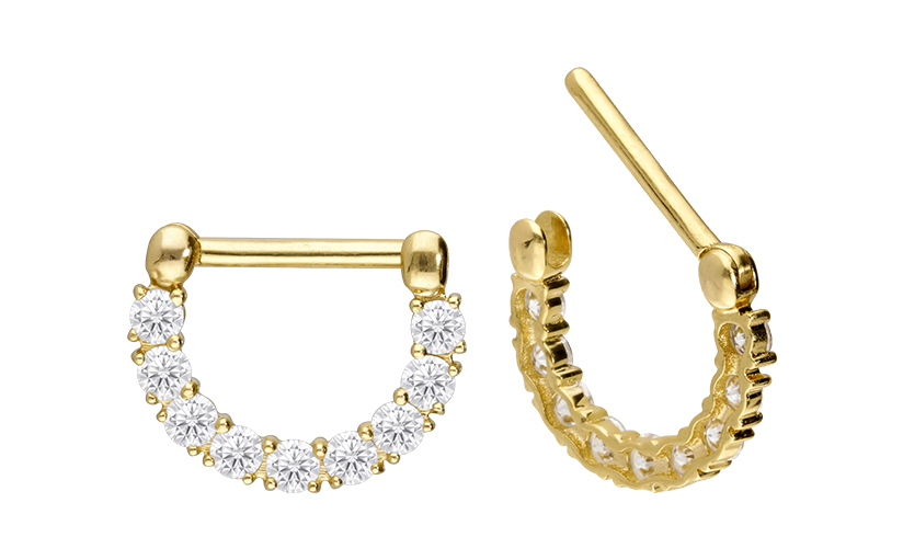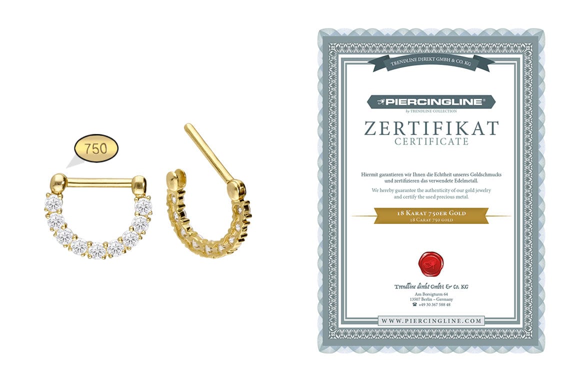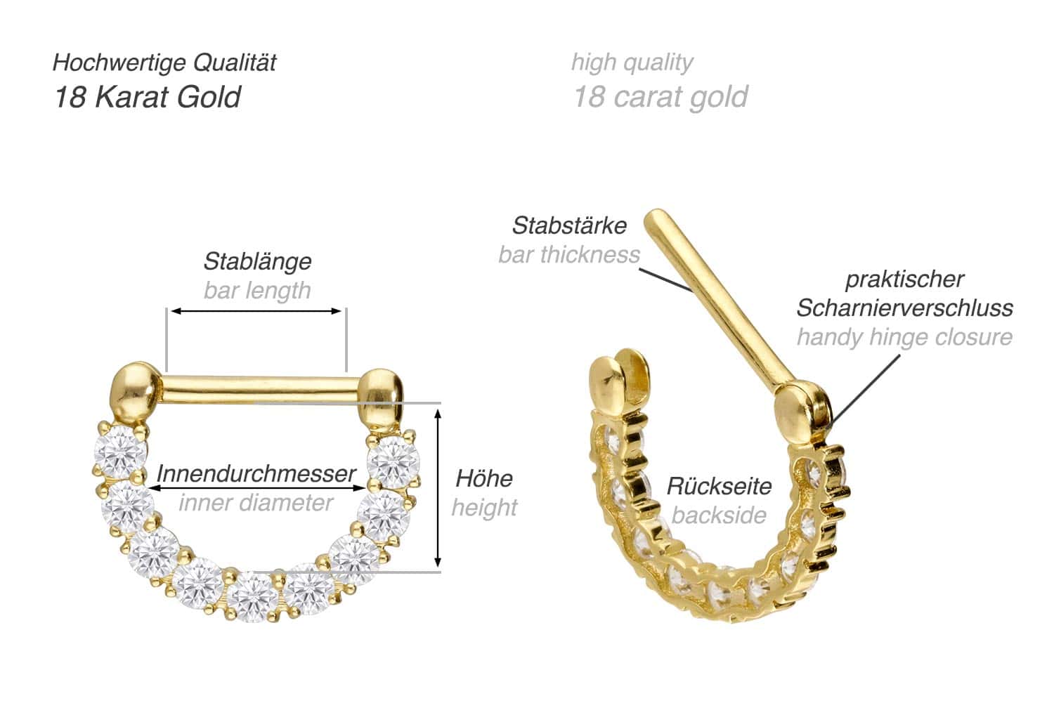 Easy handling and gorgeous design - that is what our clickers are all about! The main feature of the clickers is the practical hinge, which simplifies the piercing's insertion. Except for the moissanites, this precious clicker is made entirely of high quality 18 carat (750) yellow gold, which in addition to its excellent quality also knows how to impress with properties such as good skin compatibility and high durability. The moissanite gives the piece of jewellery its extraordinary, diamond-like shine. Each and every one of our gold items is handcrafted with great attention to detail, making it one of a kind. As a special highlight, nine set crystals adorn the stylish clicker. Whether at the ear, the nose or the lip - our clickers are suitable for a variety of different piercing locations. This clicker has a bar thickness of 1.2 mm, while its available inner diameter is 8.5 mm.
