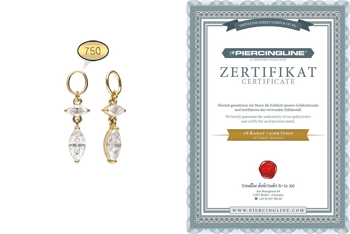 Clickers with a bar thickness from 0.8 mm to 2.5 mm are given an imaginative and thus also individual design thanks to our unique pendants! For this, the clicker must only be opened and the piece of jewelry attached. Except for the moissanites, it is made entirely of high quality 18 carat (750) yellow gold, whose material properties include good skin compatibility and high durability. The moissanite gives the piece of jewellery its extraordinary, diamond-like shine. Each and every one of our gold items is handcrafted with great attention to detail, making it one of a kind. Thus, this delightful pendant in the shape of two drops becomes an excellent addition to any matching clicker!