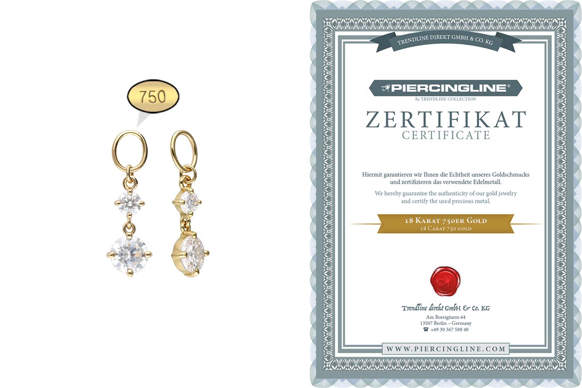 Clickers with a bar thickness from 0.8 mm to 2.5 mm are given an imaginative and thus also individual design thanks to our unique pendants! For this, the clicker must only be opened and the piece of jewelry attached. Except for the moissanites, it is made entirely of high quality 18 carat (750) yellow gold, whose material properties include good skin compatibility and high durability. The moissanite gives the piece of jewellery its extraordinary, diamond-like shine. Each and every one of our gold items is handcrafted with great attention to detail, making it one of a kind.