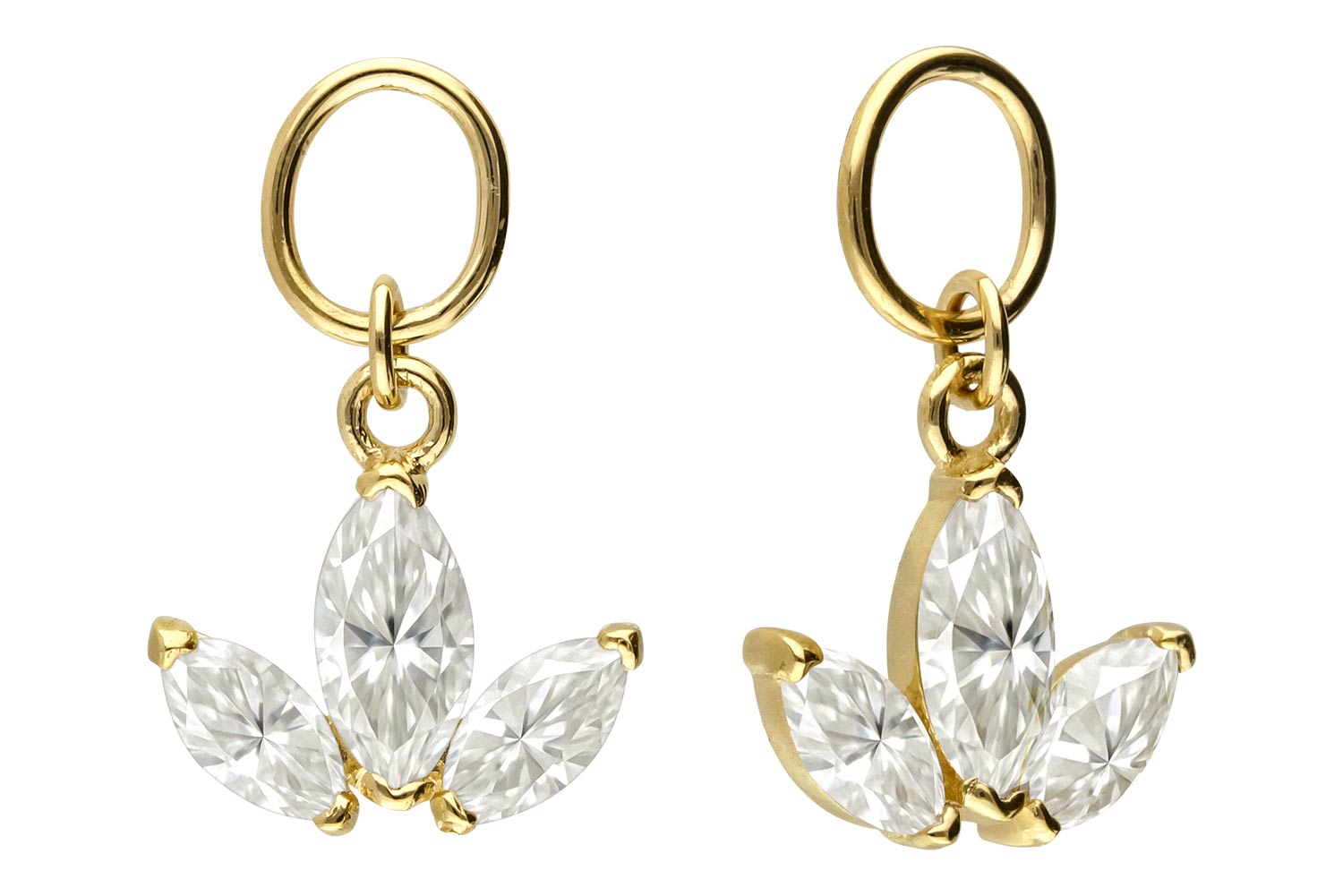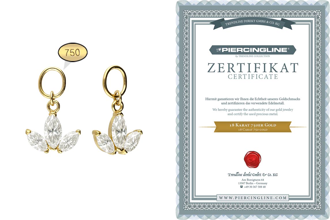 Clickers with a bar thickness from 0.8 mm to 2.5 mm are given an imaginative and thus also individual design thanks to our unique pendants! For this, the clicker must only be opened and the piece of jewelry attached. Except for the moissanites, it is made entirely of high quality 18 carat (750) yellow gold, whose material properties include good skin compatibility and high durability. The moissanite gives the piece of jewellery its extraordinary, diamond-like shine. Each and every one of our gold items is handcrafted with great attention to detail, making it one of a kind. Thus, this delightful pendant in the shape of a lotus blossom becomes an excellent addition to any matching clicker!