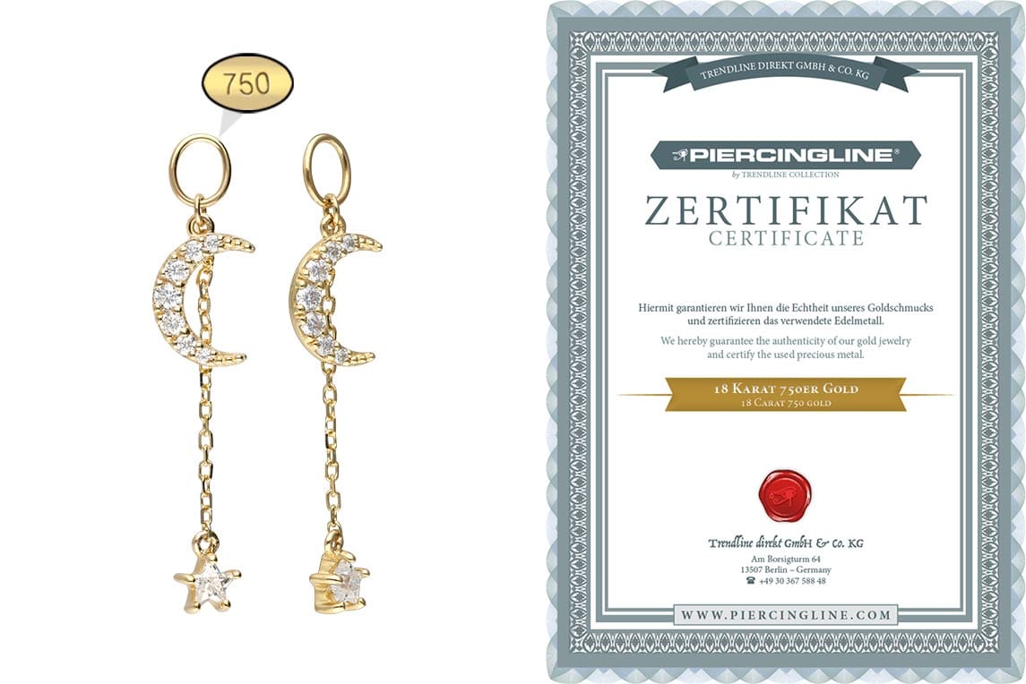 Clickers with a bar thickness from 0.8 mm to 2.5 mm are given an imaginative and thus also individual design thanks to our unique pendants! For this, the clicker must only be opened and the piece of jewelry attached. Except for the moissanites, it is made entirely of high quality 18 carat (750) yellow gold, whose material properties include good skin compatibility and high durability. The moissanite gives the piece of jewellery its extraordinary, diamond-like shine. Each and every one of our gold items is handcrafted with great attention to detail, making it one of a kind. Thus, this delightful pendant in the shape of a moon connected to star becomes an excellent addition to any matching clicker!