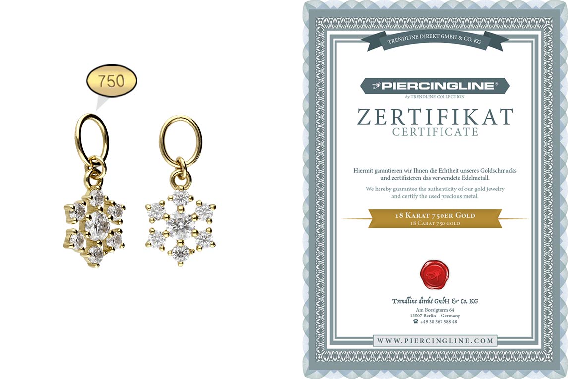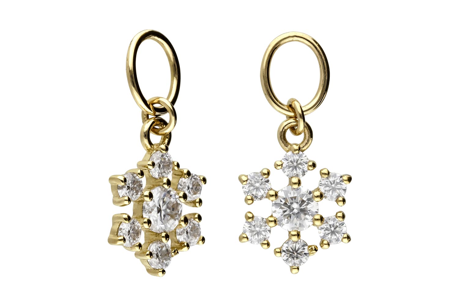 Clickers with a bar thickness from 0.8 mm to 2.5 mm are given an imaginative and thus also individual design thanks to our unique pendants! For this, the clicker must only be opened and the piece of jewelry attached. Except for the moissanites, it is made entirely of high quality 18 carat (750) yellow gold, whose material properties include good skin compatibility and high durability. The moissanite gives the piece of jewellery its extraordinary, diamond-like shine. Each and every one of our gold items is handcrafted with great attention to detail, making it one of a kind. Thus, this delightful pendant in the shape of a snowflake becomes an excellent addition to any matching clicker!