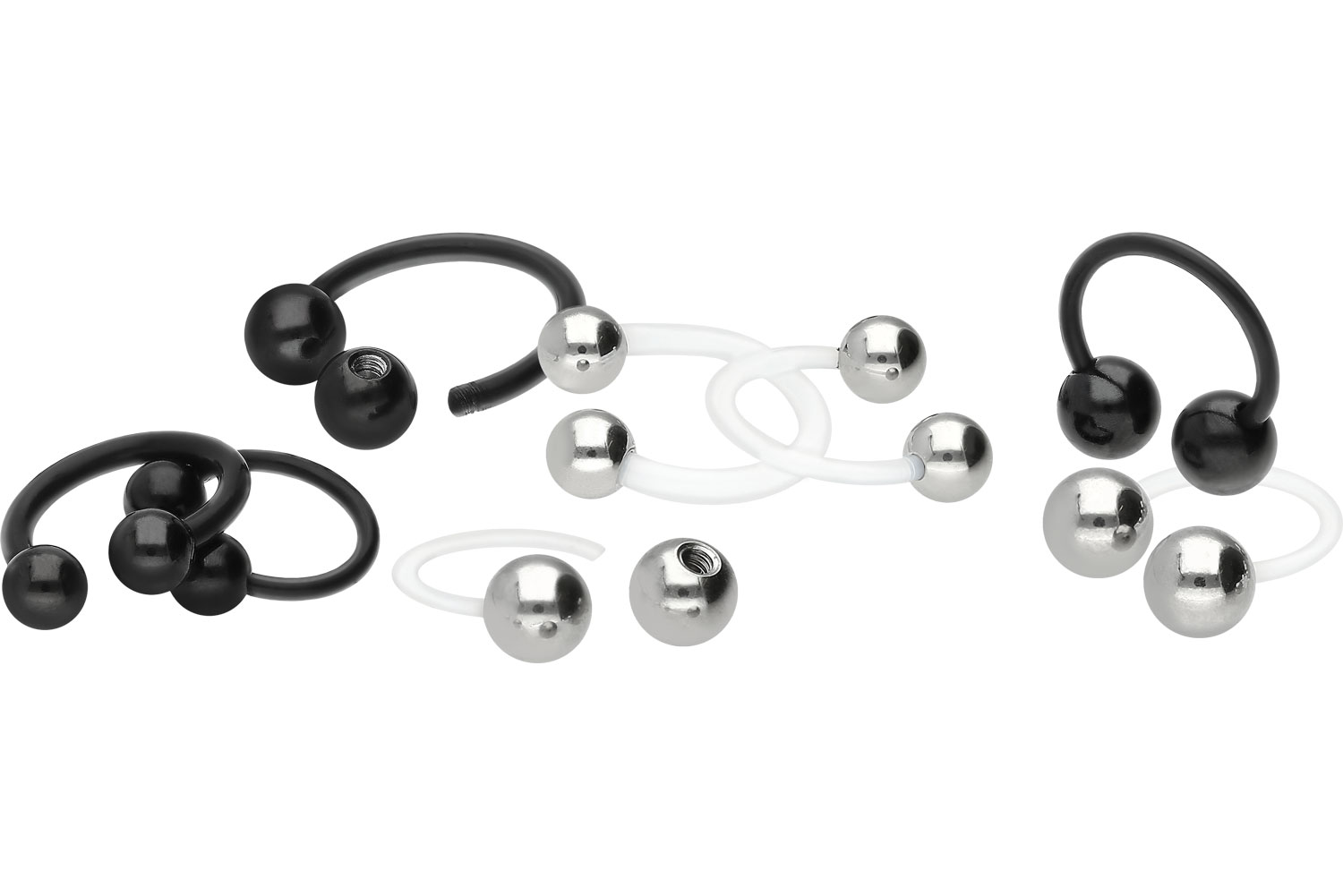 This classic circular barbell is mainly made of high quality PTFE, also known under the trade name Teflon. Only the balls consist of titanium instead. In addition to their excellent quality, both materials feature other useful properties such as particularly good skin compatibility and durability. PTFE has the additional advantages of flexibility and adaptability. In the case of this item, the latter is noticeable in the fact that the ring can be shortened as desired with ordinary household scissors. A new thread can then be screwed in with the help of the ball, so that an optimal hold is maintained. The circular barbell has a bar thickness of either 1.2 or 1.6 mm and is available in the inner diameters listed below.