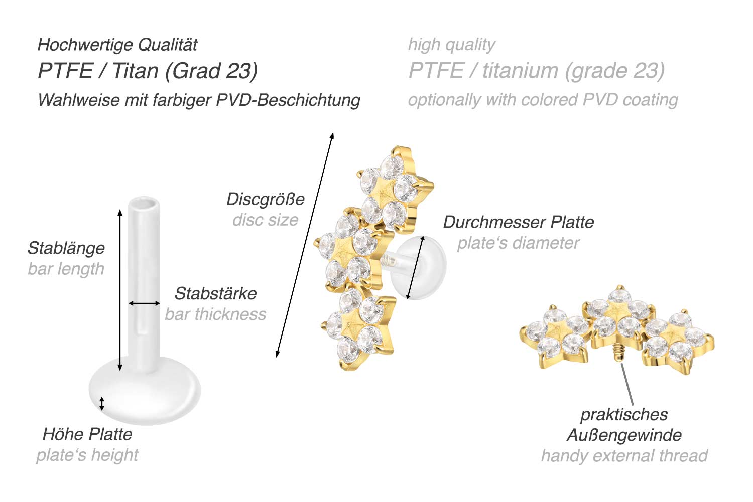 This unique labret is made of high quality PTFE, also known under the trade name Teflon. Only the screw-in attachment with external thread in form of three crystal flowers consists of titanium instead. In addition to their excellent quality, both materials feature other useful properties such as particularly good skin compatibility and durability. PTFE has the additional advantages of flexibility and adaptability. In the case of this item, the latter is noticeable in the fact that the bar can be shortened as desired with ordinary household scissors. A new thread can then be screwed in with the help of the attachment, so that an optimal hold is maintained. The advantages of titanium include color fastness, also guaranteed in the colored versions with PVD coating. The labret has a bar thickness of either 1.2 or 1.6 mm and is available with the bar lengths listed below. Furthermore, its 0.9 mm internal thread can be combined at will with all of our other screw-in attachments with this kind of external thread.