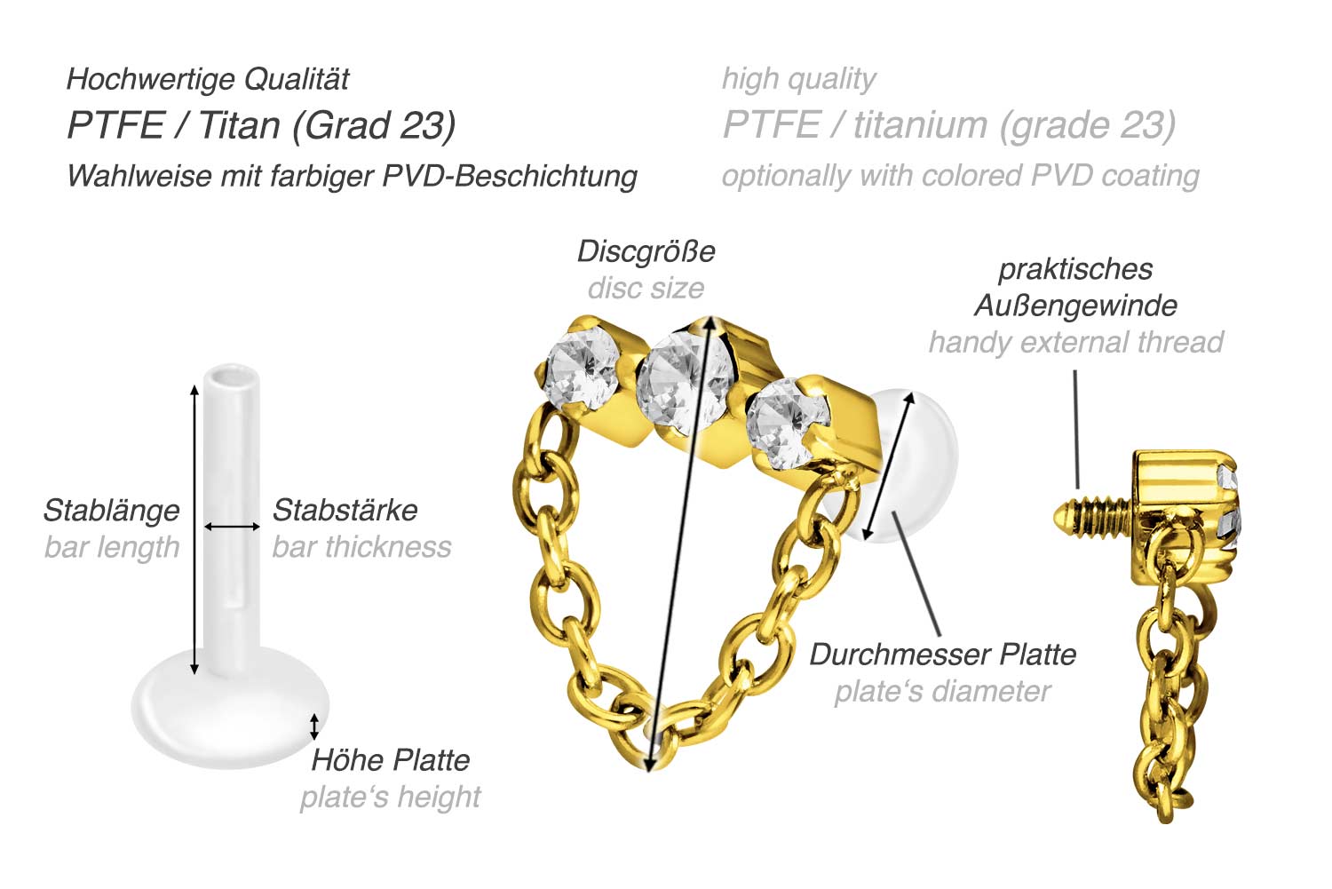 This unique labret is made of high quality PTFE, also known under the trade name Teflon. Only the screw-in attachment with external thread in form of three sparkling crystals, to which a chain is attached,consists of titanium instead. In addition to their excellent quality, both materials feature other useful properties such as particularly good skin compatibility and durability. PTFE has the additional advantages of flexibility and adaptability. In the case of this item, the latter is noticeable in the fact that the bar can be shortened as desired with ordinary household scissors. A new thread can then be screwed in with the help of the attachment, so that an optimal hold is maintained. The advantages of titanium include