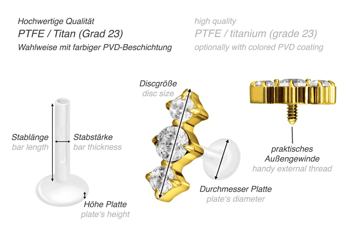 This unique labret is made of high quality PTFE, also known under the trade name Teflon. Only the screw-in attachment with external thread in form of three sparkling crystals with settings consists of titanium instead. In addition to their excellent quality, both materials feature other useful properties such as particularly good skin compatibility and durability. PTFE has the additional advantages of flexibility and adaptability. In the case of this item, the latter is noticeable in the fact that the bar can be shortened as desired with ordinary household scissors. A new thread can then be screwed in with the help of the attachment, so that an optimal hold is maintained. The advantages of titanium include