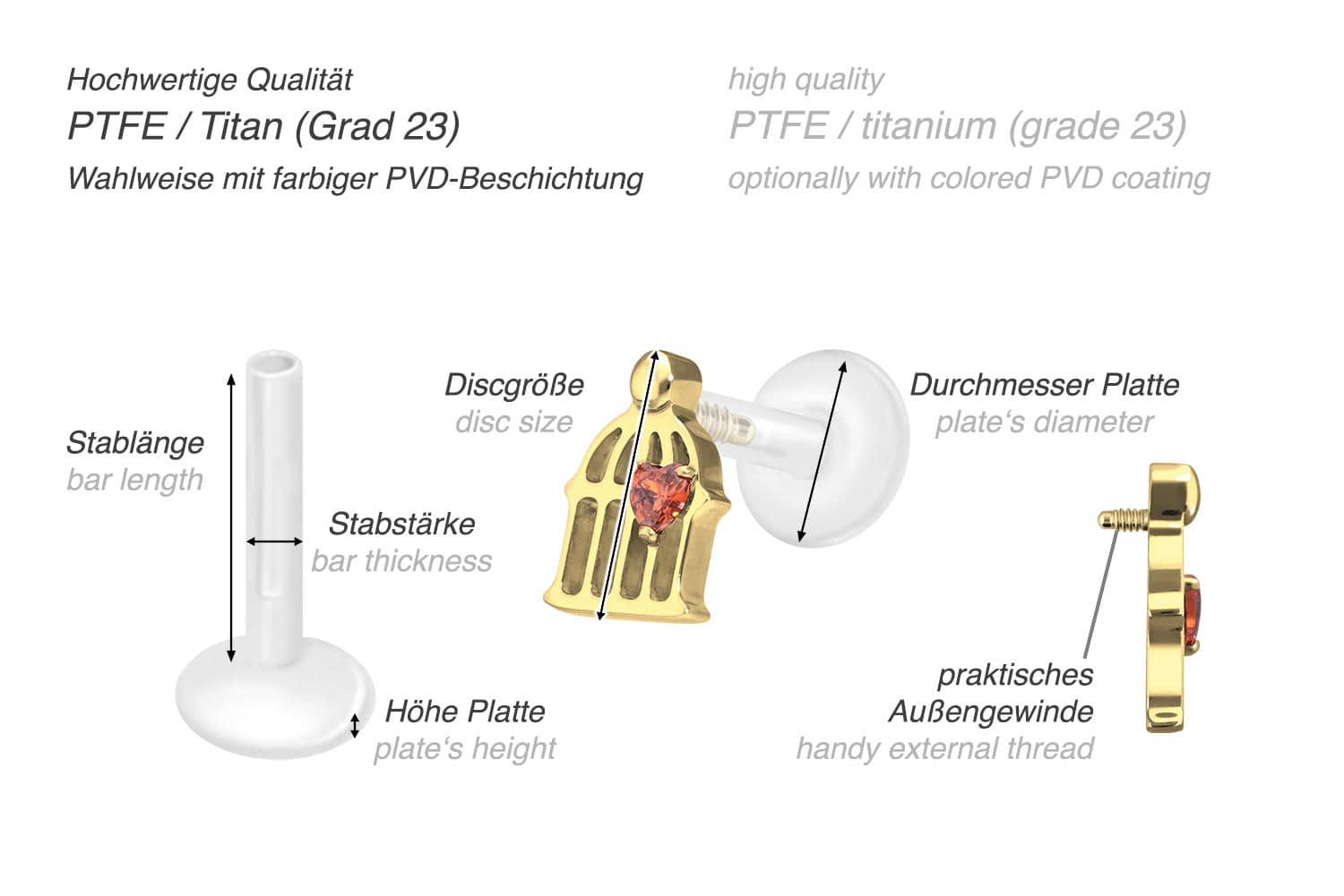 This unique labret is made of high quality PTFE, also known under the trade name Teflon. Only the screw-in attachment with external thread in form of a cage consists of titanium instead. In addition to their excellent quality, both materials feature other useful properties such as particularly good skin compatibility and durability. PTFE has the additional advantages of flexibility and adaptability. In the case of this item, the latter is noticeable in the fact that the bar can be shortened as desired with ordinary household scissors. A new thread can then be screwed in with the help of the attachment, so that an optimal hold is maintained. The advantages of titanium include color fastness, also guaranteed in the colored versions with PVD coating. The labret has a bar thickness of either 1.2 or 1.6 mm and is available with the bar lengths listed below. Furthermore, its 0.9 mm internal thread can be combined at will with all of our other screw-in attachments with this kind of external thread.