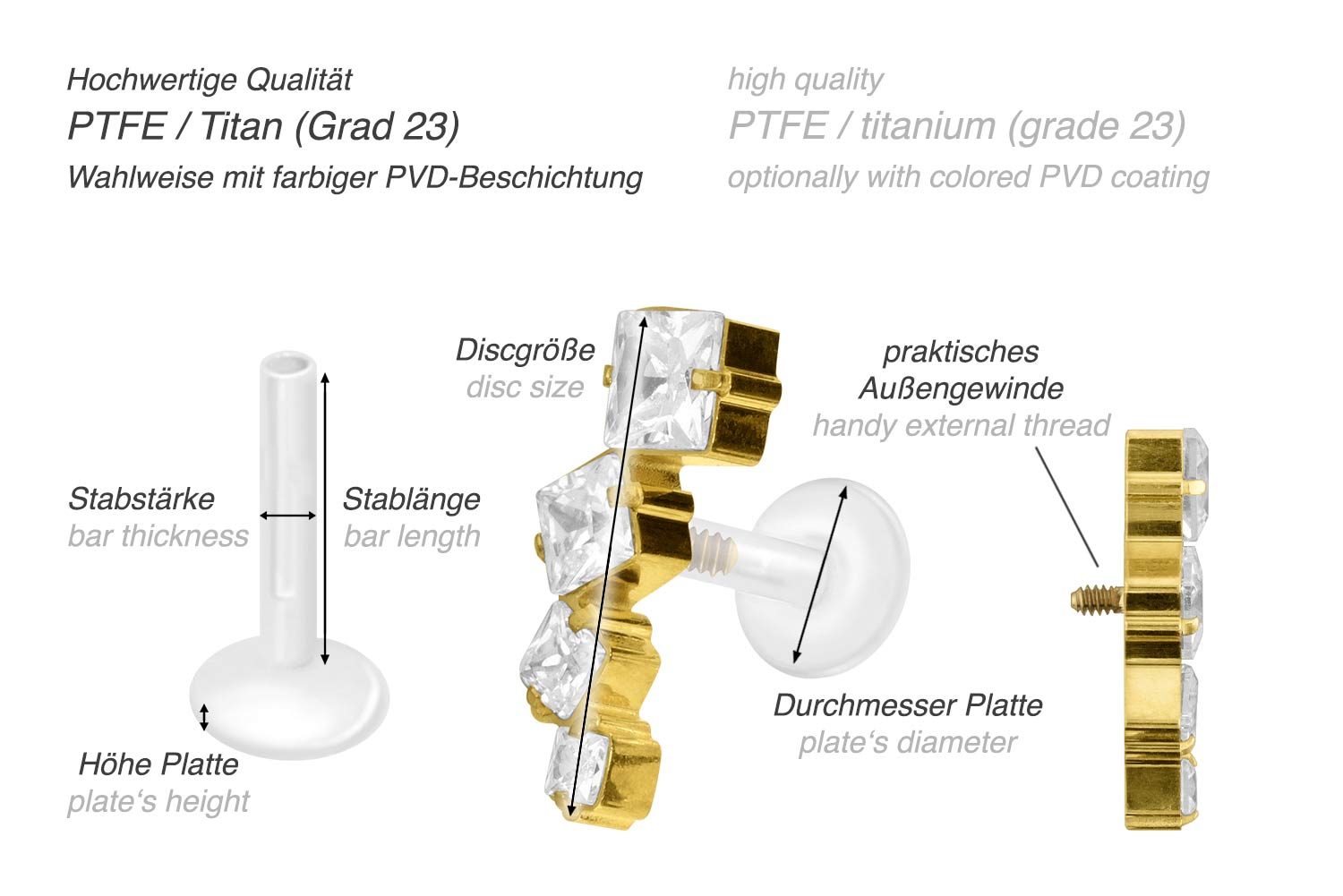 This unique labret is made of high quality PTFE, also known under the trade name Teflon. Only the screw-in attachment with external thread in form of a crystal arch consists of titanium instead. In addition to their excellent quality, both materials feature other useful properties such as particularly good skin compatibility and durability. PTFE has the additional advantages of flexibility and adaptability. In the case of this item, the latter is noticeable in the fact that the bar can be shortened as desired with ordinary household scissors. A new thread can then be screwed in with the help of the attachment, so that an optimal hold is maintained. The advantages of titanium include