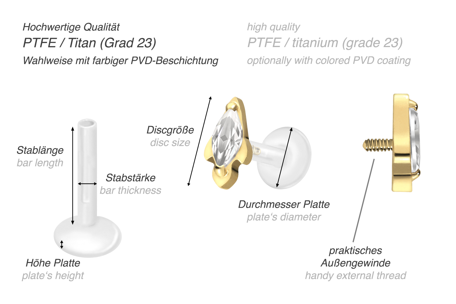 This unique labret is made of high quality PTFE, also known under the trade name Teflon. Only the screw-in attachment with external thread in form of a rocket consists of titanium instead. In addition to their excellent quality, both materials feature other useful properties such as particularly good skin compatibility and durability. PTFE has the additional advantages of flexibility and adaptability. In the case of this item, the latter is noticeable in the fact that the bar can be shortened as desired with ordinary household scissors. A new thread can then be screwed in with the help of the attachment, so that an optimal hold is maintained. The advantages of titanium include color fastness, also guaranteed in the colored versions with PVD coating. The labret has a bar thickness of either 1.2 or 1.6 mm and is available with the bar lengths listed below. Furthermore, its 0.9 mm internal thread can be combined at will with all of our other screw-in attachments with this kind of external thread.