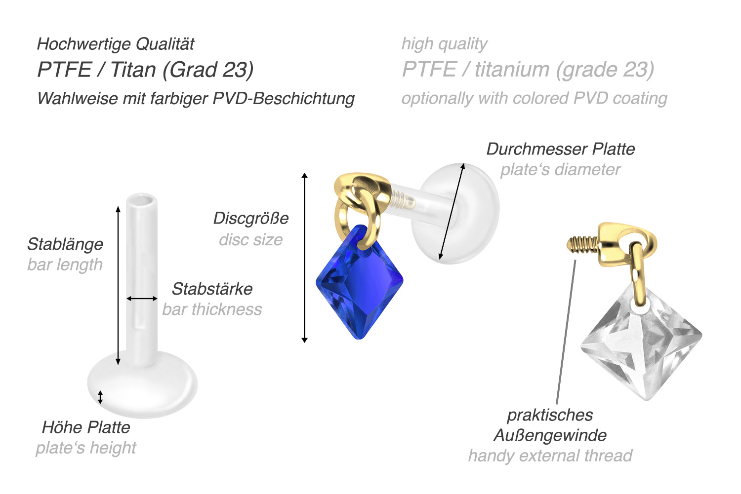 PTFE - Labret with internal Thread + Titanium Attachment Crystal Square