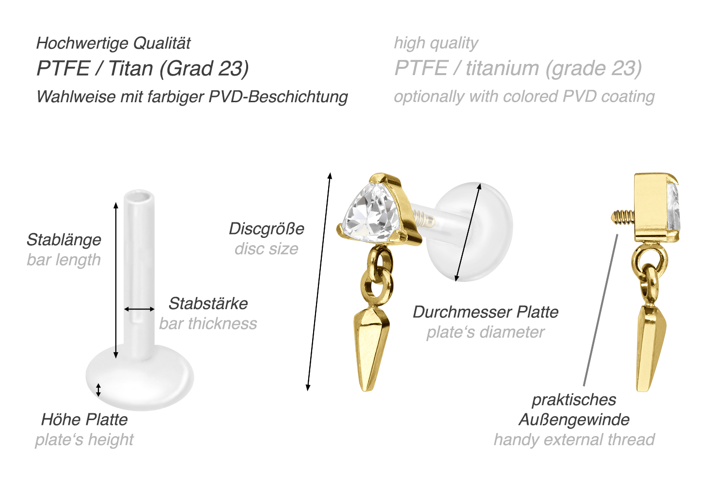 This unique labret is made of high quality PTFE, also known under the trade name Teflon. Only the screw-in attachment with external thread in form of a crystal triangle, to which a cone is attached, consists of titanium instead. In addition to their excellent quality, both materials feature other useful properties such as particularly good skin compatibility and durability. PTFE has the additional advantages of flexibility and adaptability. In the case of this item, the latter is noticeable in the fact that the bar can be shortened as desired with ordinary household scissors. A new thread can then be screwed in with the help of the attachment, so that an optimal hold is maintained. The advantages of titanium include color fastness, also guaranteed in the colored versions with PVD coating. The labret has a bar thickness of either 1.2 or 1.6 mm and is available with the bar lengths listed below. Furthermore, its 0.9 mm internal thread can be combined at will with all of our other screw-in attachments with this kind of external thread.