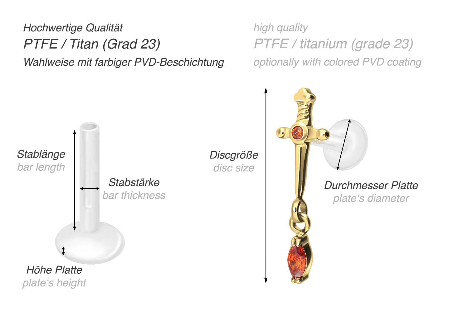 This unique labret is made of high quality PTFE, also known under the trade name Teflon. Only the screw-in attachment with external thread in form of a dagger, to which a crystal drop is attached, consists of titanium instead. In addition to their excellent quality, both materials feature other useful properties such as particularly good skin compatibility and durability. PTFE has the additional advantages of flexibility and adaptability. In the case of this item, the latter is noticeable in the fact that the bar can be shortened as desired with ordinary household scissors. A new thread can then be screwed in with the help of the attachment, so that an optimal hold is maintained. The advantages of titanium include color fastness, also guaranteed in the colored versions with PVD coating. The labret has a bar thickness of either 1.2 or 1.6 mm and is available with the bar lengths listed below. Furthermore, its 0.9 mm internal thread can be combined at will with all of our other screw-in attachments with this kind of external thread.