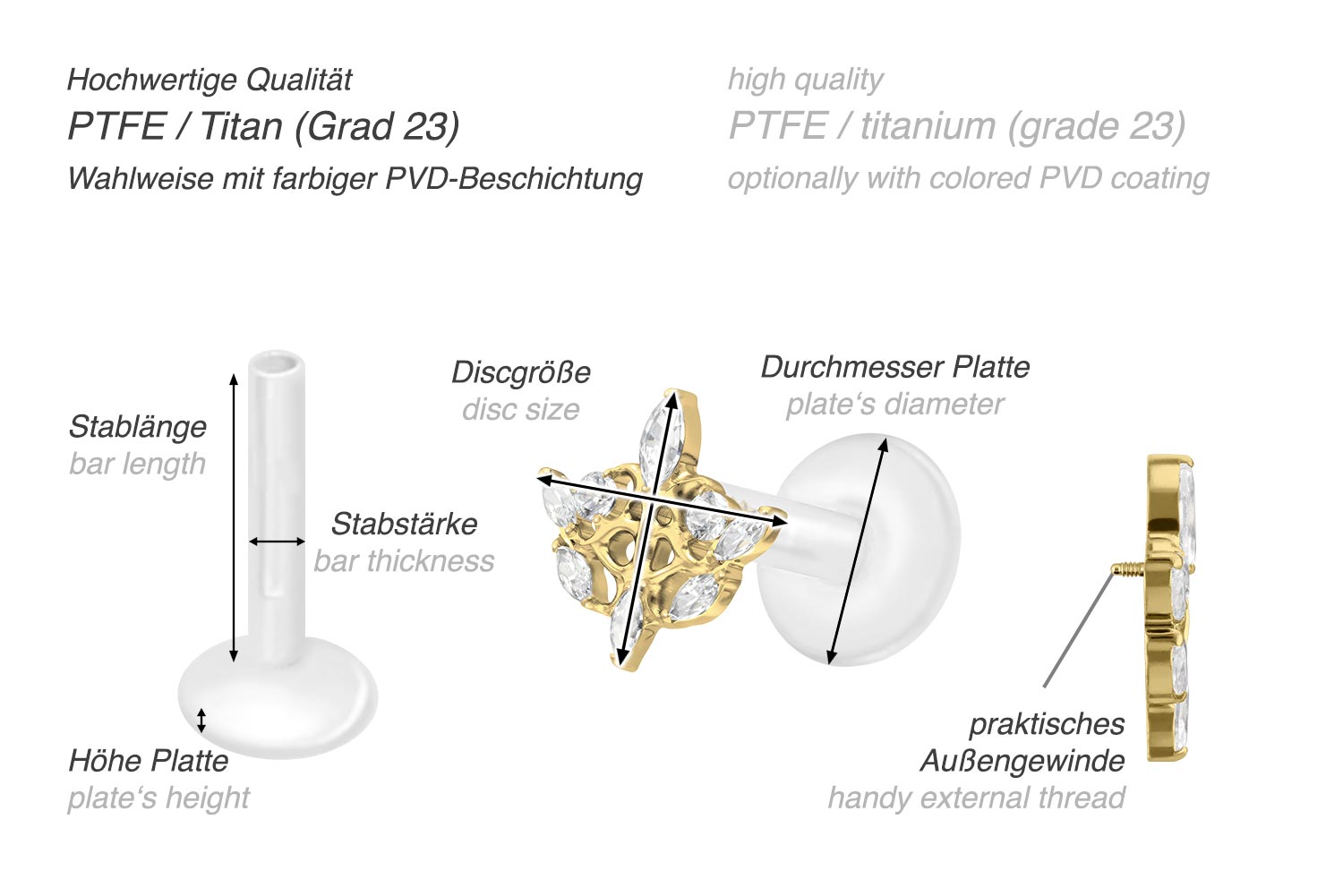 This unique labret is made of high quality PTFE, also known under the trade name Teflon. Only the screw-in attachment with external thread in form of a gothic design consists of titanium instead. In addition to their excellent quality, both materials feature other useful properties such as particularly good skin compatibility and durability. PTFE has the additional advantages of flexibility and adaptability. In the case of this item, the latter is noticeable in the fact that the bar can be shortened as desired with ordinary household scissors. A new thread can then be screwed in with the help of the attachment, so that an optimal hold is maintained. The advantages of titanium include color fastness, also guaranteed in the colored versions with PVD coating. The labret has a bar thickness of either 1.2 or 1.6 mm and is available with the bar lengths listed below. Furthermore, its 0.9 mm internal thread can be combined at will with all of our other screw-in attachments with this kind of external thread.