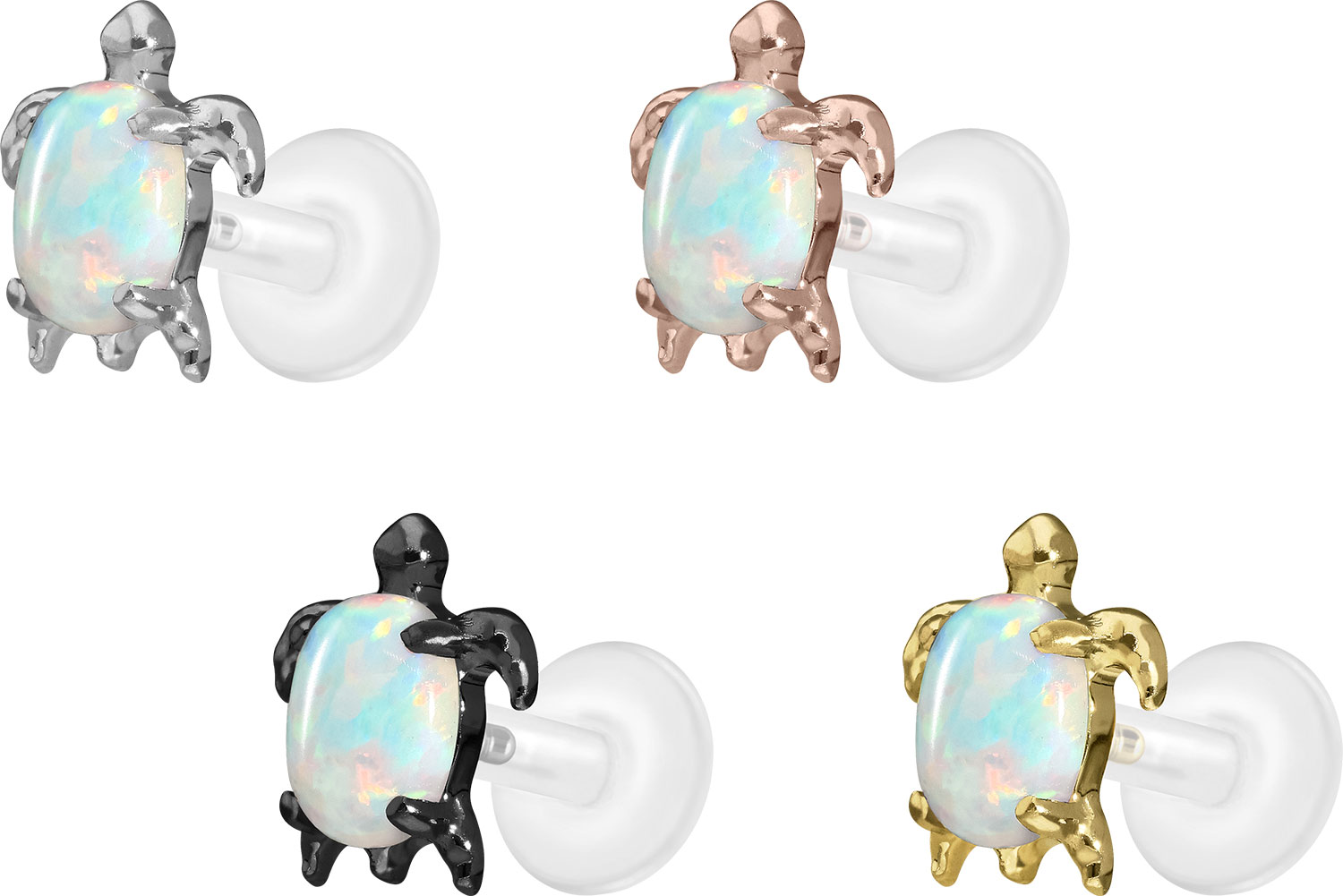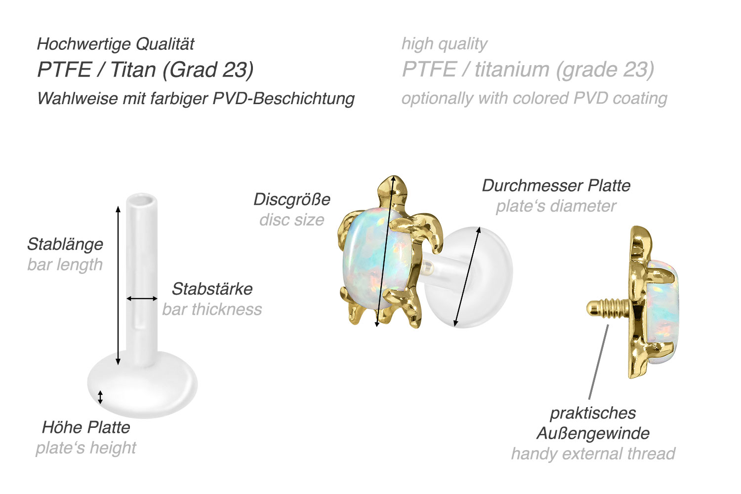 This unique labret is made of high quality PTFE, also known under the trade name Teflon. Only the screw-in attachment with external thread in form of a turtle consists of titanium instead. In addition to their excellent quality, both materials feature other useful properties such as particularly good skin compatibility and durability. PTFE has the additional advantages of flexibility and adaptability. In the case of this item, the latter is noticeable in the fact that the bar can be shortened as desired with ordinary household scissors. A new thread can then be screwed in with the help of the attachment, so that an optimal hold is maintained. The advantages of titanium include color fastness, also guaranteed in the colored versions with PVD coating. The labret has a bar thickness of either 1.2 or 1.6 mm and is available with the bar lengths listed below. Furthermore, its 0.9 mm internal thread can be combined at will with all of our other screw-in attachments with this kind of external thread.