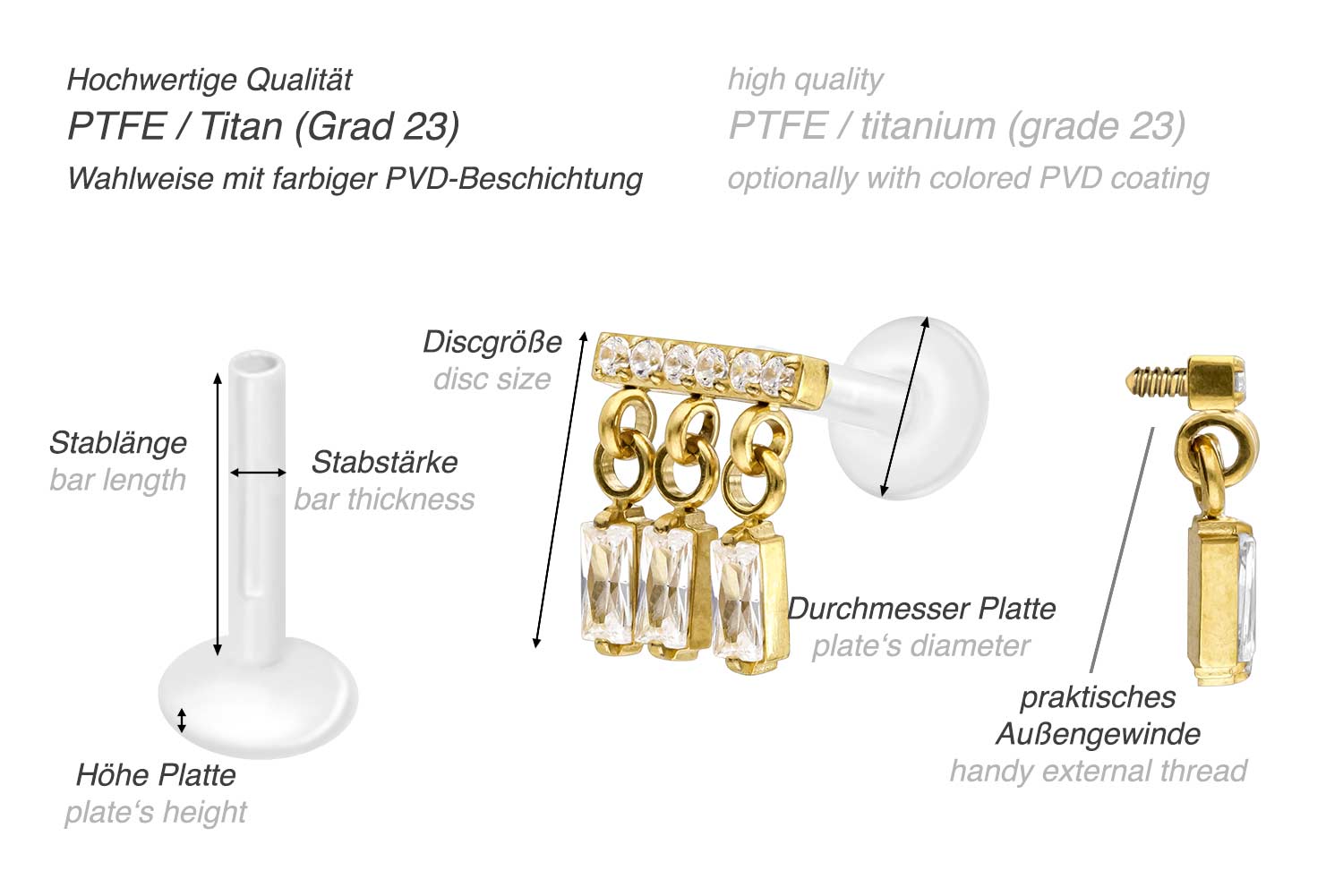 This unique labret is made of high quality PTFE, also known under the trade name Teflon. Only the screw-in attachment with external thread in form of a wind chime consists of titanium instead. In addition to their excellent quality, both materials feature other useful properties such as particularly good skin compatibility and durability. PTFE has the additional advantages of flexibility and adaptability. In the case of this item, the latter is noticeable in the fact that the bar can be shortened as desired with ordinary household scissors. A new thread can then be screwed in with the help of the attachment, so that an optimal hold is maintained. The advantages of titanium include