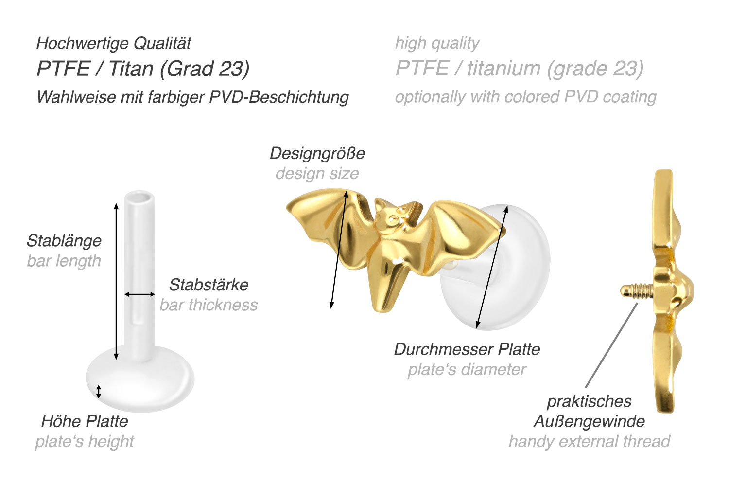 This unique labret is made of high quality PTFE, also known under the trade name Teflon. Only the screw-in attachment with external thread in form of a ....... consists of titanium instead. In addition to their excellent quality, both materials feature other useful properties such as particularly good skin compatibility and durability. PTFE has the additional advantages of flexibility and adaptability. In the case of this item, the latter is noticeable in the fact that the bar can be shortened as desired with ordinary household scissors. A new thread can then be screwed in with the help of the attachment, so that an optimal hold is maintained. The advantages of titanium include