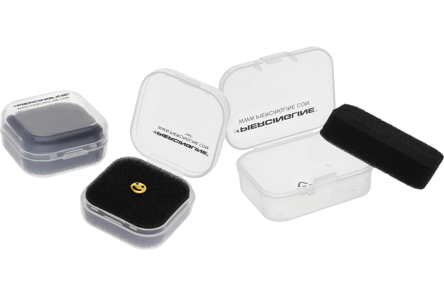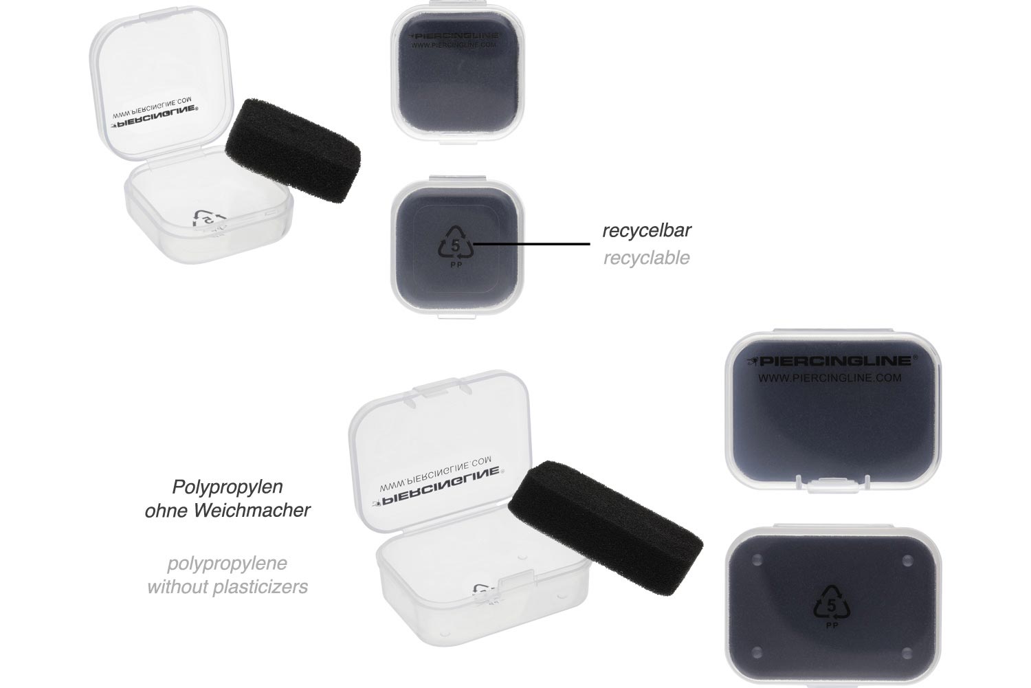 Whether as gift packaging or simply for storing small pieces of jewelry and piercings - this equally elegant as high quality plastic box can be ideally used for both purposes. The material is more precisely polypropylene, made without plasticizers, recyclable and also usable for food. It furthermore optimally protects the contents from external influences, while the soft foam at the same time provides the necessary hold and thus also protection inside. The externally visible black "Piercingline" lettering makes the overall appearance of the box look particularly classy.