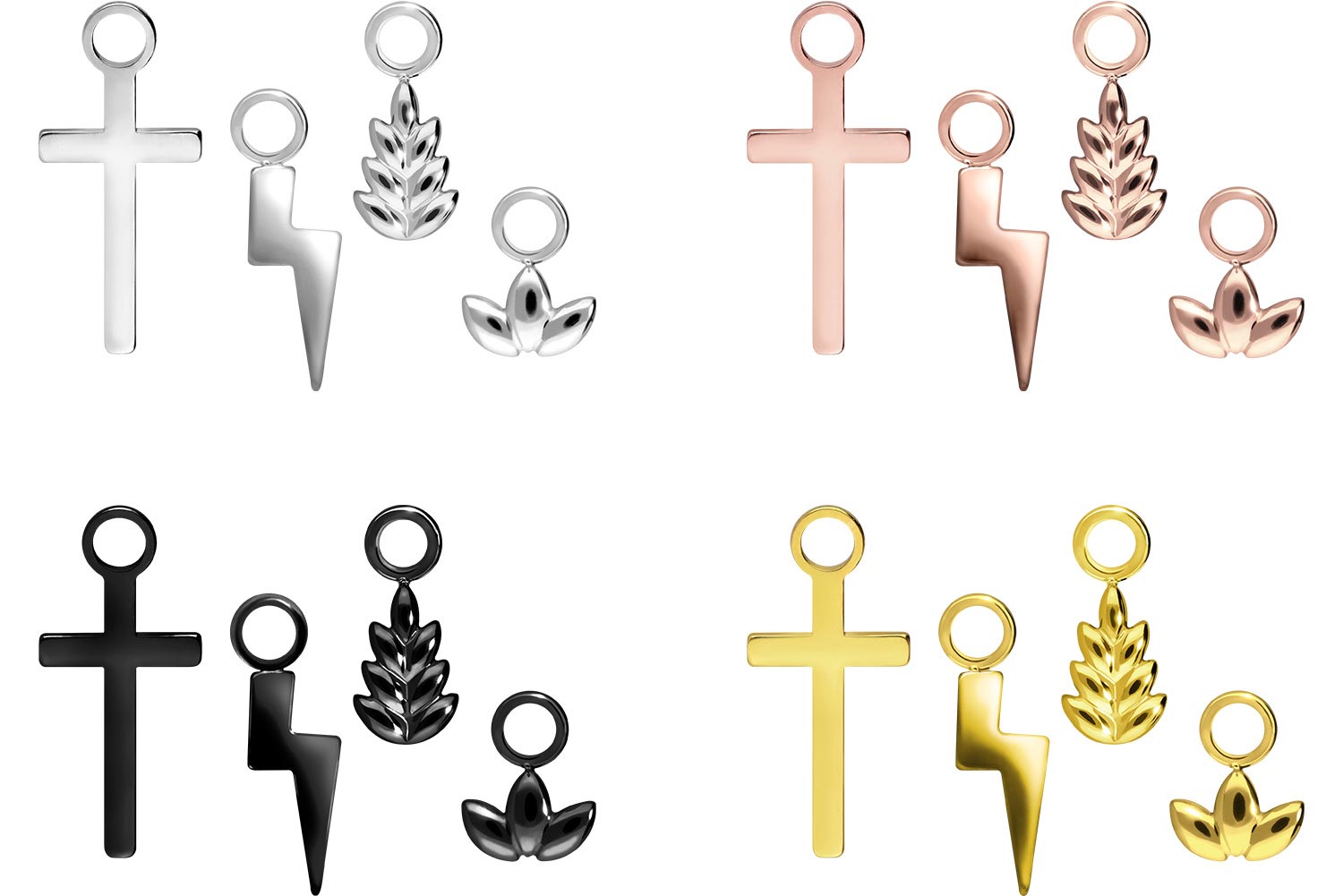 Clickers with a bar thickness from 0.8 mm to 2 mm are given an imaginative and thus also individual design thanks to our unique pendants! For this, the clicker must only be opened and the piece of jewelry attached. They are made of high quality surgical steel 316L, whose material properties include flat texture and high durability. On top of that, there is color fastness, guaranteed in the silver-colored as well as in the other variants with colored PVD coating. This set consists of items with four different designs, so that the most suitable pendant for every occasion can be found. Thus, these delightful pendants become an excellent addition to any matching clicker!