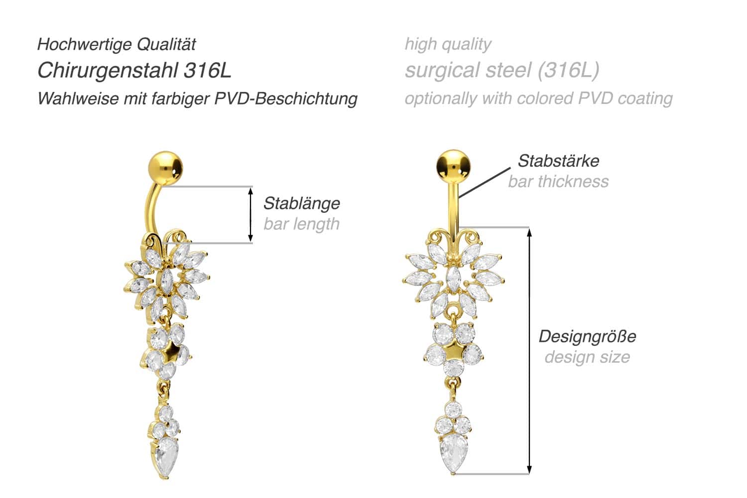 This bananabell is made of high quality surgical steel 316L, which is covered with a scratch-resistant PVD coating, depending on the color desired. Besides high quality, the material properties of surgical steel 316l include flat texture and durability. The upper ball can be unscrewed whereas the lower design reminding of a crystal-studded butterfly is firmly attached to the bananabell. The bellybutton piercing has a bar thickness of 1.6 mm and is available with a bar length of 10 mm.