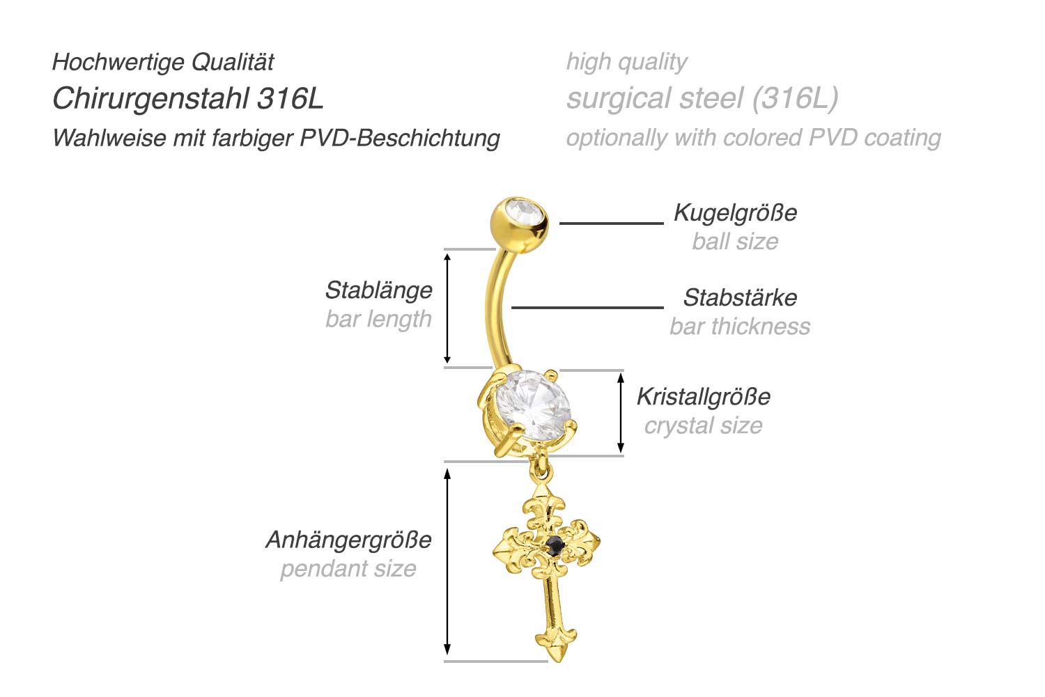 This bananabell is made of high quality surgical steel 316L, which is covered with a scratch-resistant PVD coating, depending on the color desired. Besides high quality, the material properties of surgical steel 316l include flat texture and durability. The upper ball can be unscrewed whereas the lower crystal with setting is firmly attached to the bananabell. A special highlight is the movable pendant: a beautiful cross. The bellybutton piercing has a bar thickness of 1.6 mm and is available with a bar length of 10 mm.