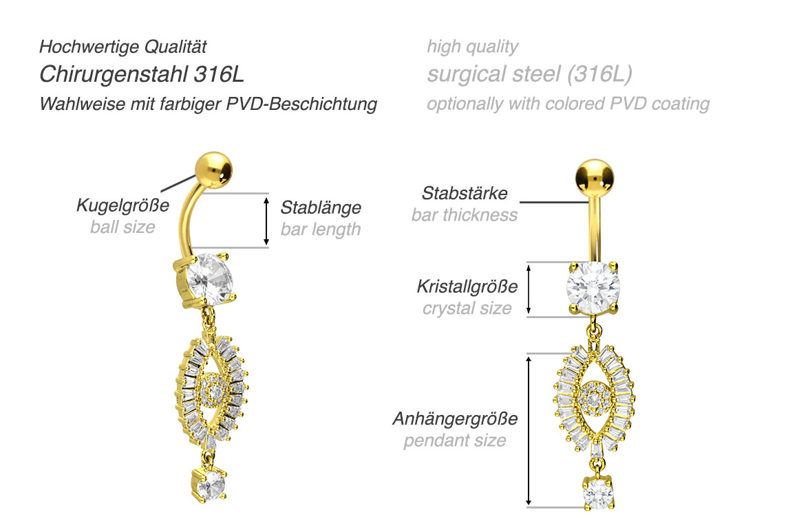 This bananabell is made of high quality surgical steel 316L, which is covered with a scratch-resistant PVD coating, depending on the color desired. Besides high quality, the material properties of surgical steel 316l include flat texture and durability. The upper ball can be unscrewed whereas the lower crystal with setting is firmly attached to the bananabell. A special highlight is the movable pendant: a sparkling crystal eye, to which another crystal is attached. The bellybutton piercing has a bar thickness of 1.6 mm and is available with a bar length of 10 mm.