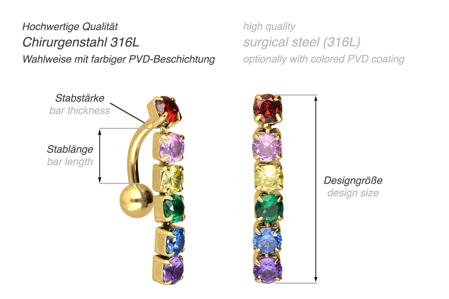 This top-insertable bananabell is made of high quality surgical steel 316L, which is covered with a scratch-resistant PVD coating, depending on the color desired. Besides high quality, the material properties of surgical steel 316l include flat texture and durability. The ball can be unscrewed whereas the design in form of a movable multicolored crystal chain is firmly attached to the bananabell. The bellybutton piercing has a bar thickness of 1.6 mm and is available with a bar length of 10 mm.