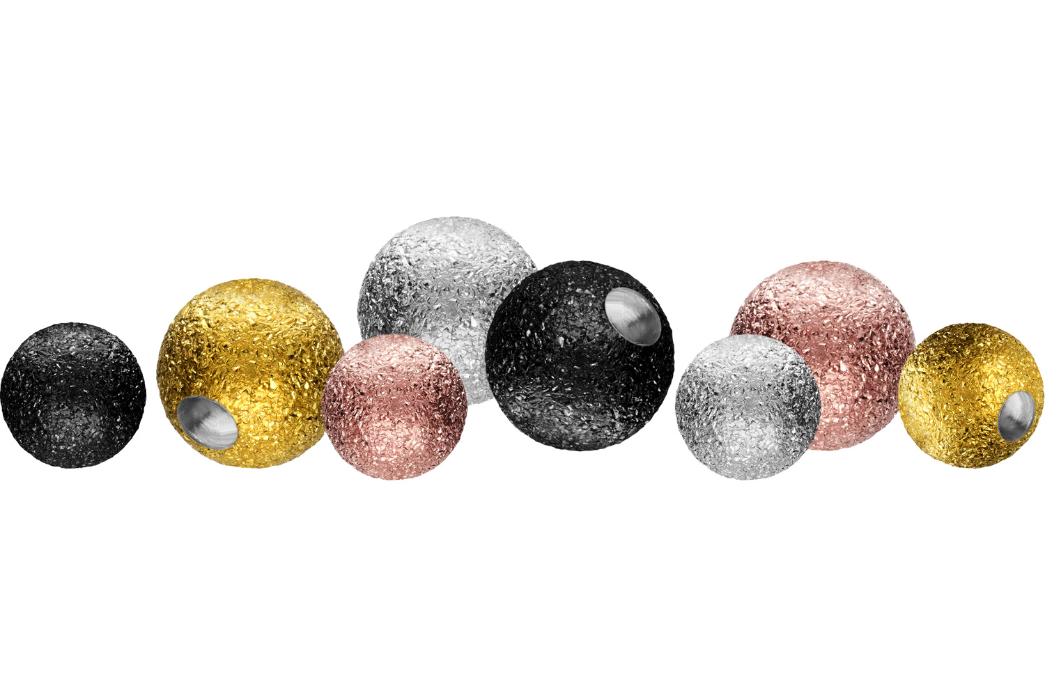 This unique clip-in ball is entirely made of high quality surgical steel 316L, whose useful material properties include both high durability and color fastness. The latter is also guaranteed in the black, gold and rose gold versions, all of which have a PVD coating. The diamond look of each clip-in ball further enhances it, adding to its unique charm. Thanks to the two small notches, numerous combinations with other items from our versatile range are possible. The piece of jewelry is available with a size of 3 mm or 4 mm.