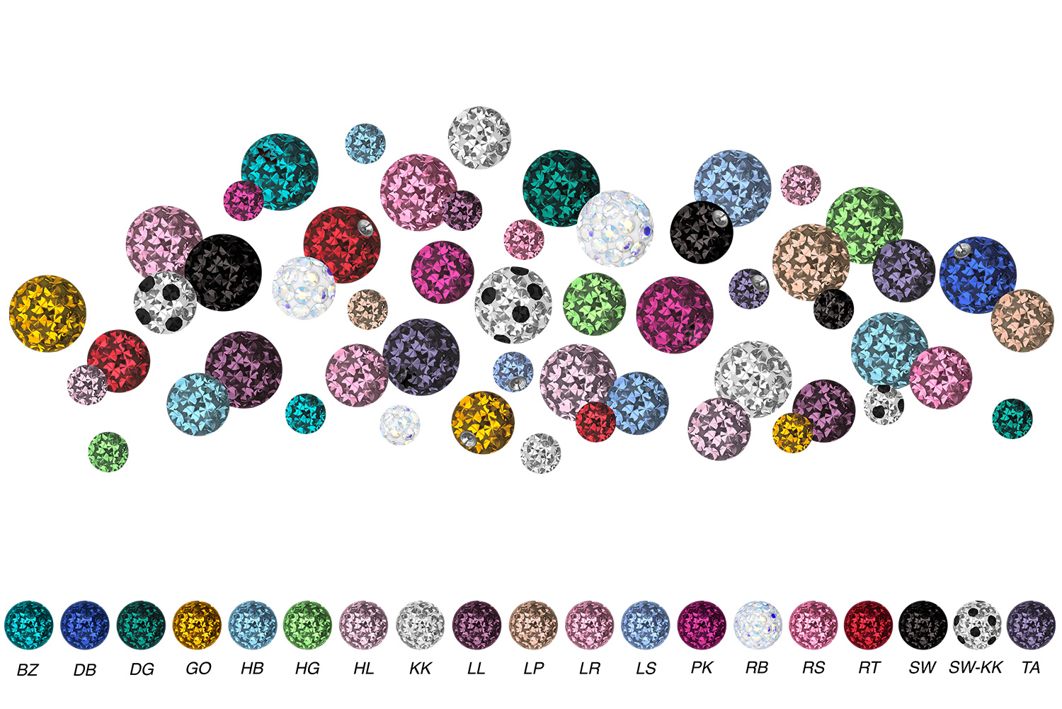 This sparkling clip-in ball is set with numerous crystals, whose protection is ensured with the help of a clear layer of epoxy resin. Moreover, the same layer creates a smooth surface, which results in a particularly high wearing comfort. Thanks to two opposing surgical steel notches, the ball can be perfectly clamped between the ends of an open ring, thus closing it securely. All available crystal colors and ball sizes are listed below.