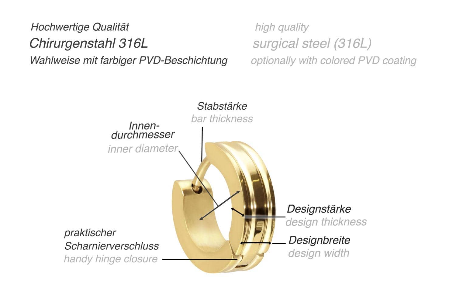 Irrespective of this, the bar thickness is always 1 mm and the inner diameter 9 mm. Thanks to their design with the two lines, the creoles prove to be ideal everyday companions. They are furthermore supplied in pairs as depicted.