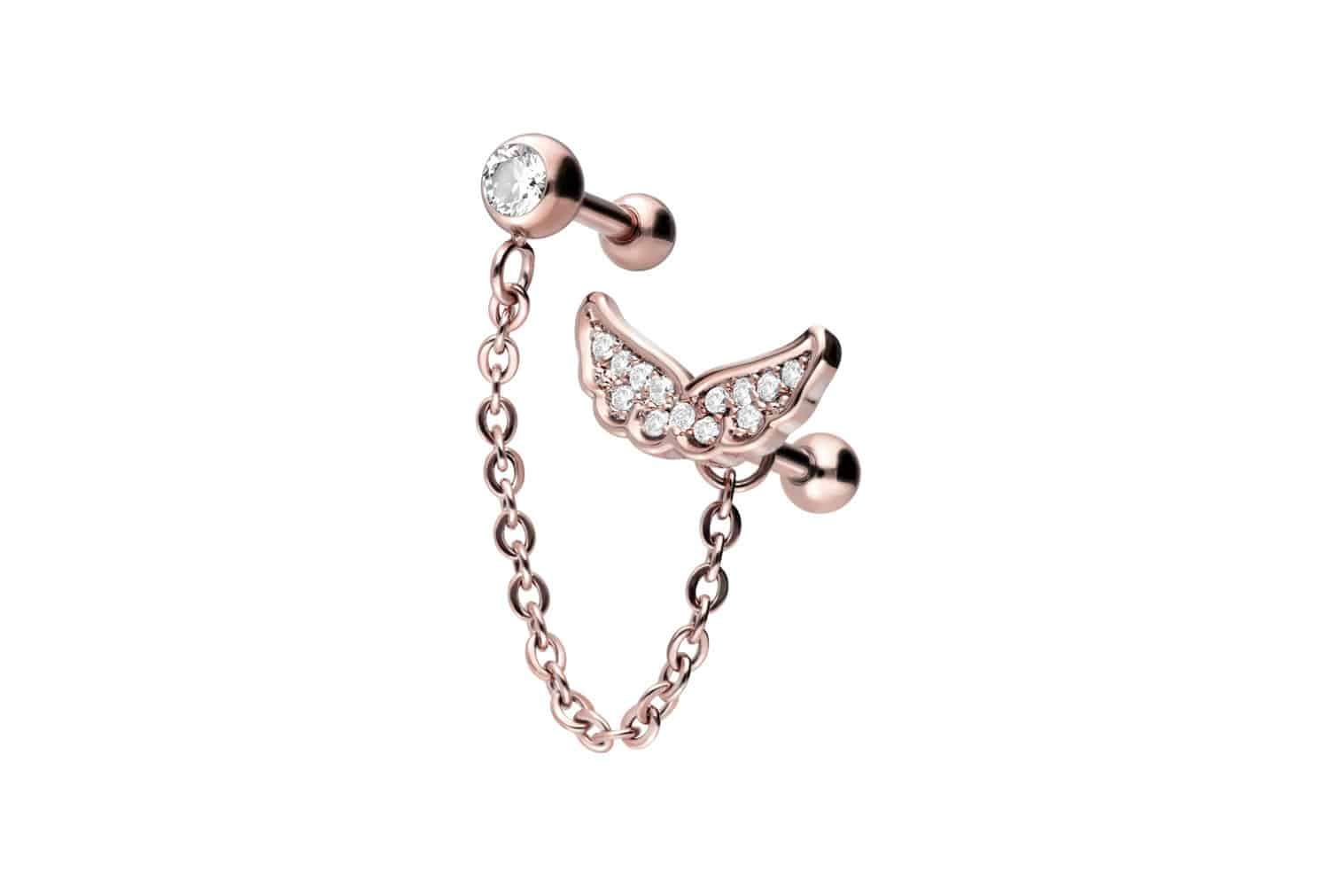 coating. Thanks to the appealing design, composed of crystal-studded wings, the piece of jewelry acquires a unique charm. The two ear piercings are connected to each other by a chain. They are available with a bar thickness of 1.2 mm and a bar length of 6 mm.