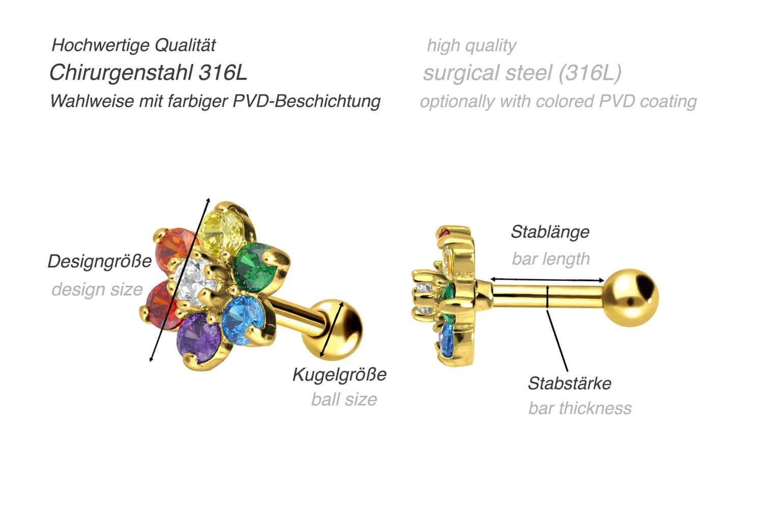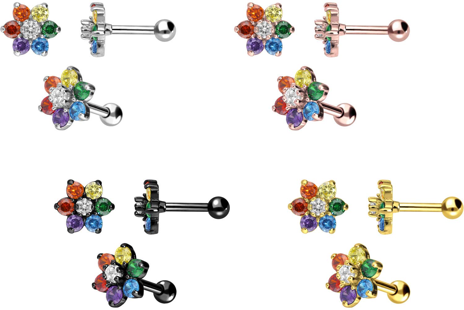 This stunningly beautiful ear piercing is made of high quality surgical steel 316L, which is known to feature material properties such as flat texture and high durability. In the case of the gold- and rosegold-colored variants, it is covered with a scratch-resistant PVD coating. Thanks to the appealing design consisting of a flower, each of whose petals is decorated with a colored crystal, the piece of jewelry acquires a unique charm. It is available with a bar thickness of 1.2 mm and a bar length of 6 mm.