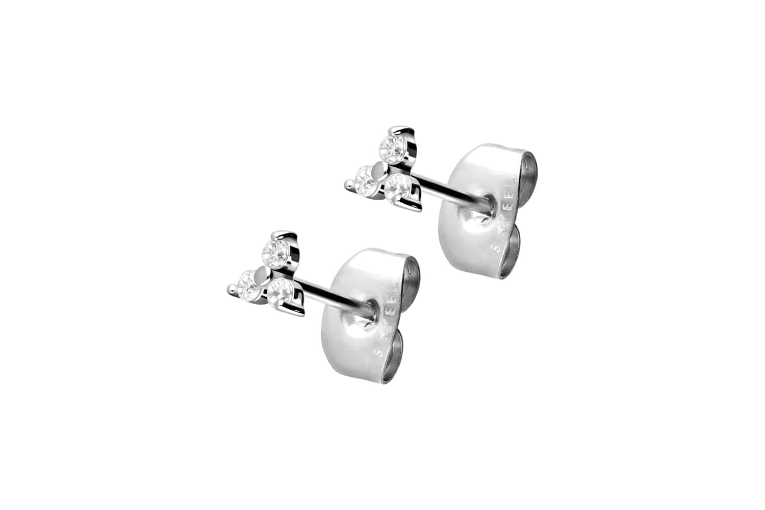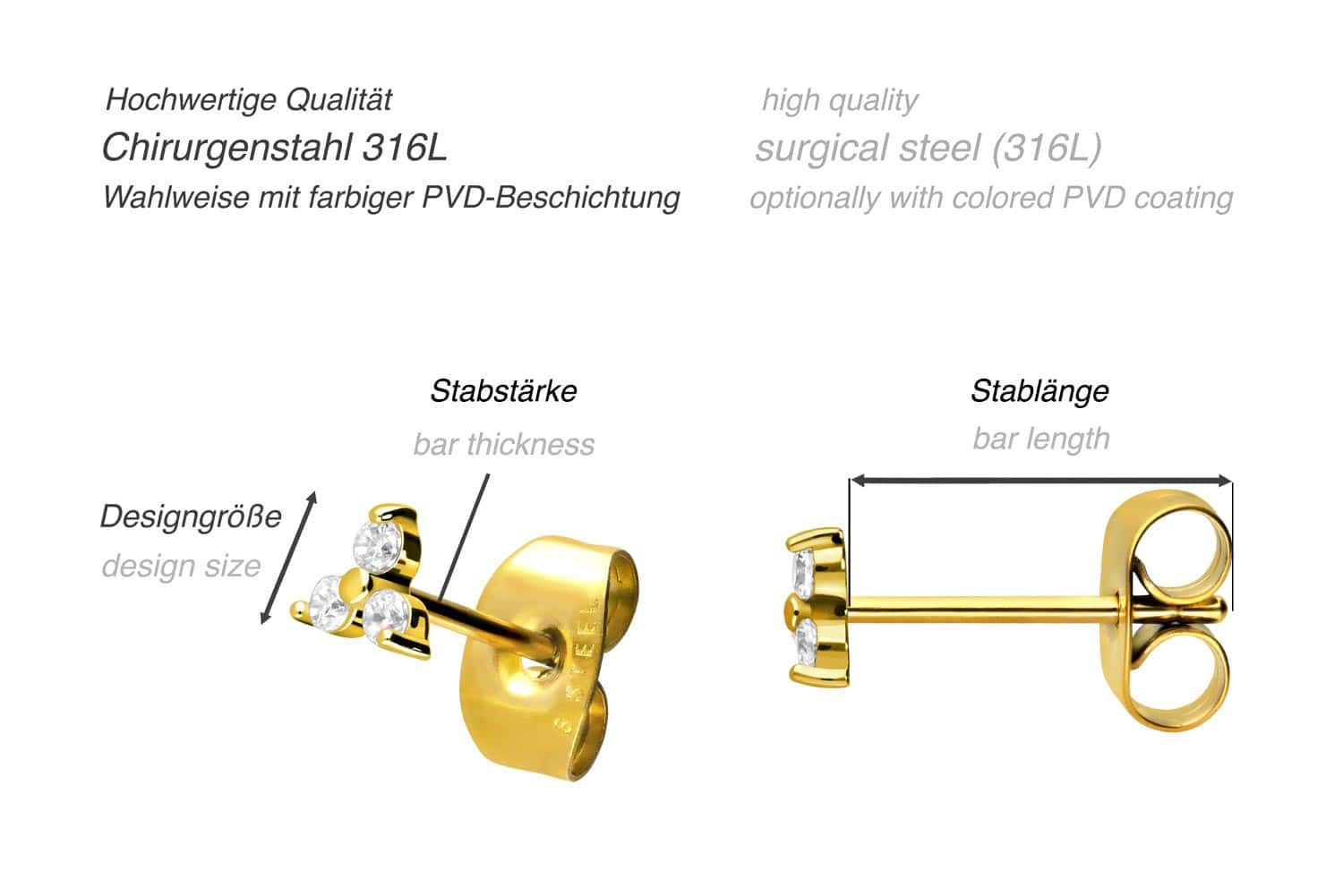 These timelessly beautiful ear studs are made of high quality surgical steel 316L, which among other advantages is characterized by high durability and flat texture. Another of its specific material properties is color fastness, also guaranteed in the variants with PVD coating. The crystals at the front ends of the ear studs make them shine in all their glory. In addition, they are supplied in pairs as depicted.