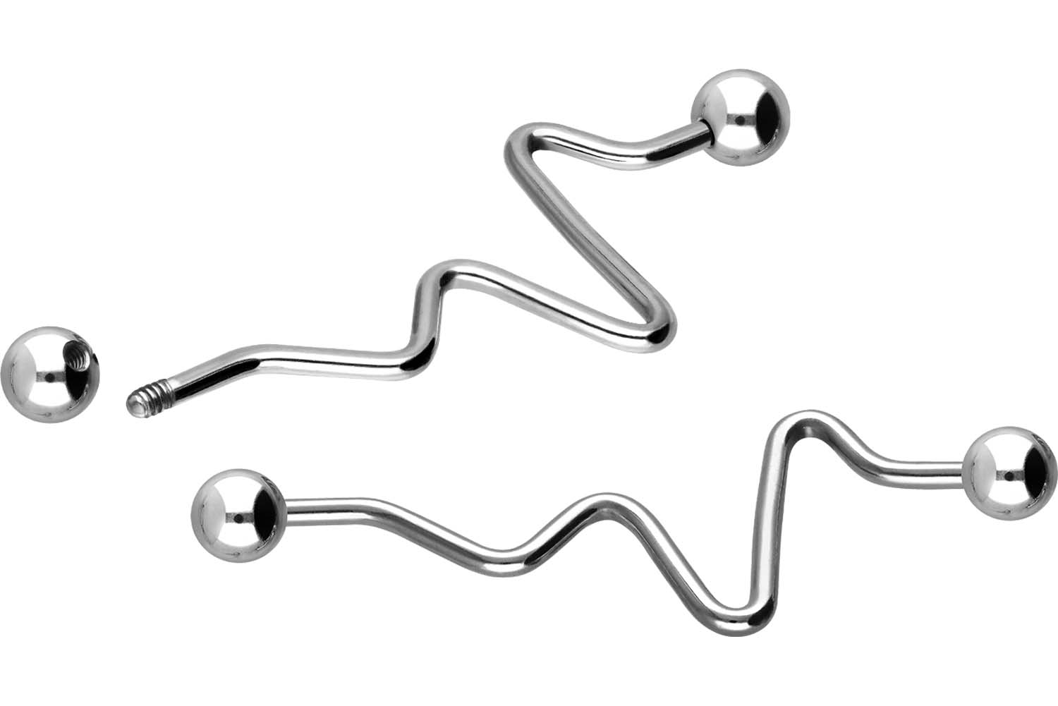 This extravagant industrial ear piercing is made entirely of high quality surgical steel 316L, which is known to have useful material properties such as high durability, color fastness and flat texture. The special shape of the bar, reminiscent of a heartbeat curve, serves as a visual highlight. At each end there is an unscrewable ball to simplify the use of the piercing. Its bar thickness is 1.6 mm, while its bar length is 37 mm.