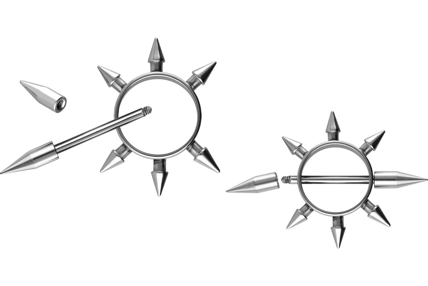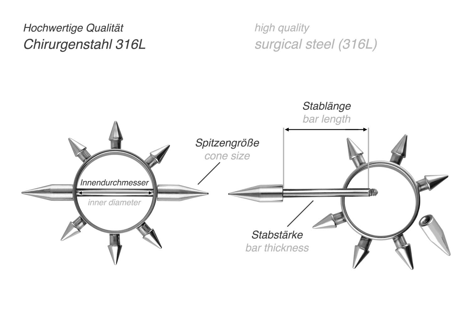 This nipple ring is made entirely of high quality surgical steel 316L, whose useful material properties include both high durability and flat texture. The latter is visually emphasized with the help of the noble highly polished finish. Inside the ring there is a barbell, at the ends of which are screwable cones. Around the ring are additionally attached several other cones. If necessary, the said barbell can also be removed and used individually. It has a bar thickness of 1.6 mm and is available in the bar lengths listed below.