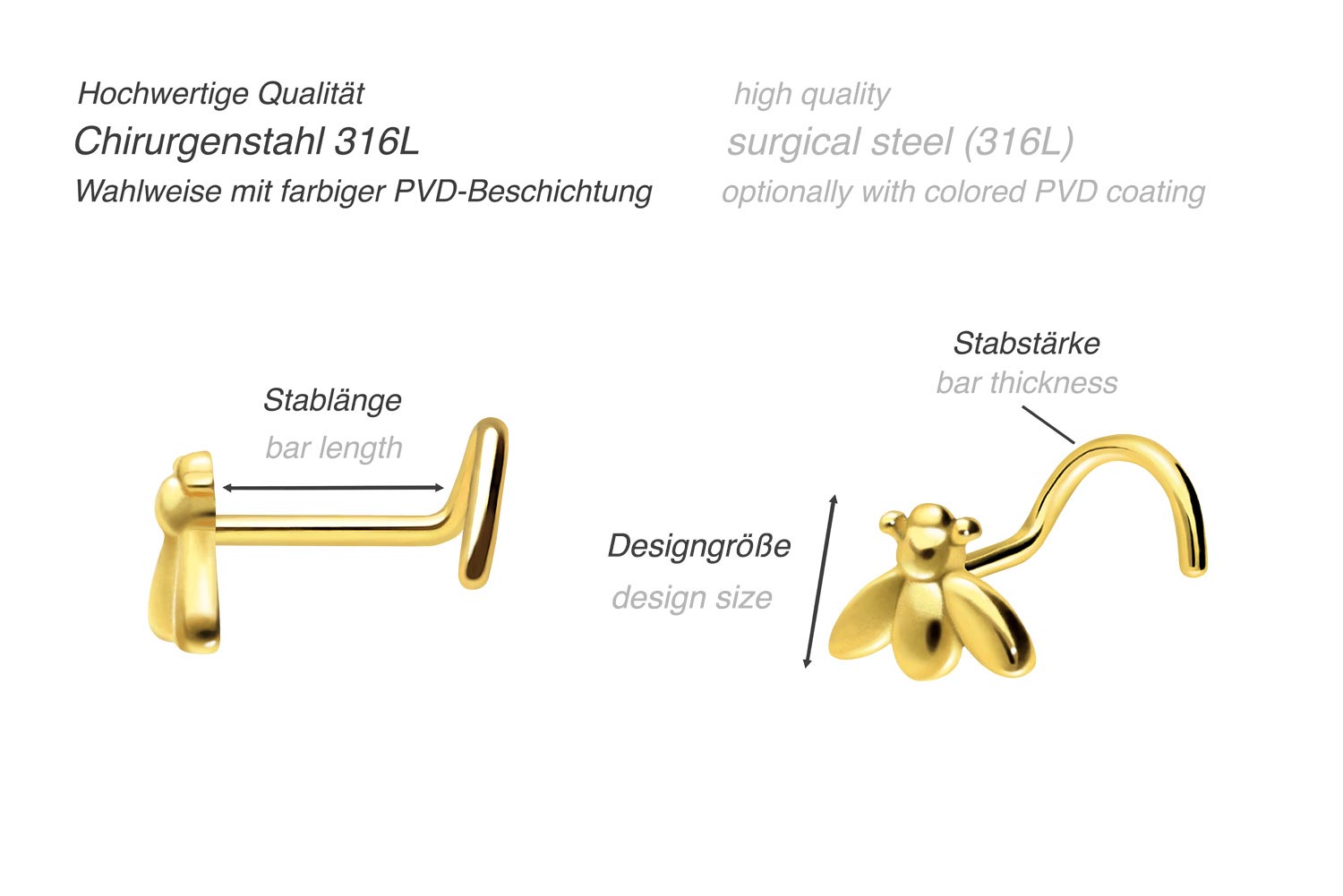 enchanting bee. The nose stud has a bar thickness of 0.8 mm and