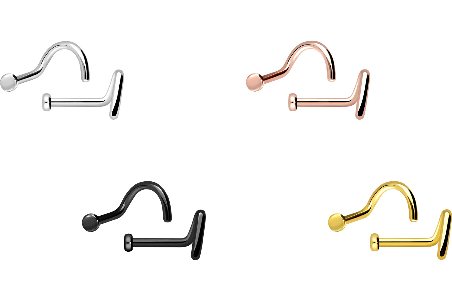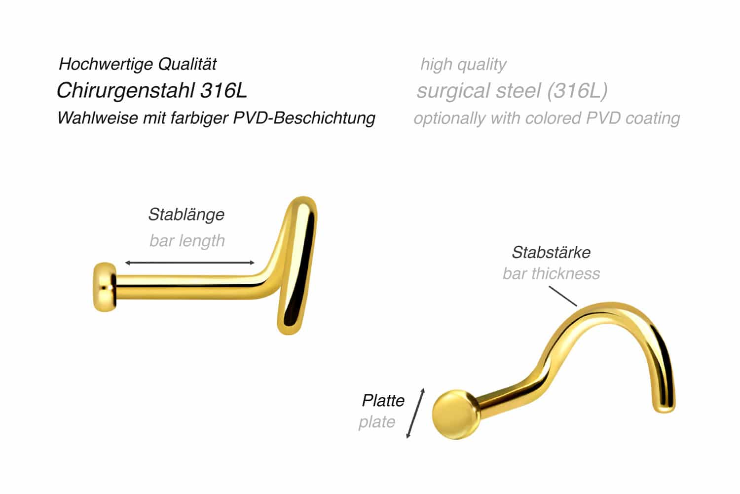 This stylish nose stud is made of high quality surgical steel 316L, which is covered with a scratch-resistant PVD coating, depending on the color desired. Besides high quality, the material properties of surgical steel 316L include flat texture. While the spiral shape ensures a better grip in the nose, the delightful design in the form of a plate adds that certain something. The nose stud has a bar thickness of 1 mm and a bar length of 6 mm.