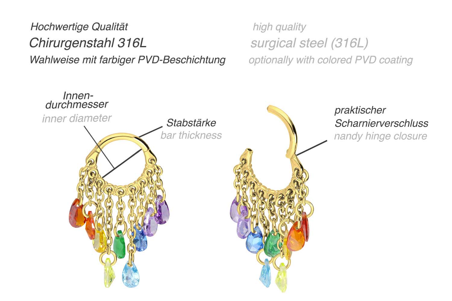 the piercing is covered with a scratch-resistant PVD coating. The piece of jewelry owes its unique charm to the design, which consists of a chain curtain with sparkling crystal drops. Whether at the ear, the nose or the lip - our clickers are suitable for a variety of different piercing