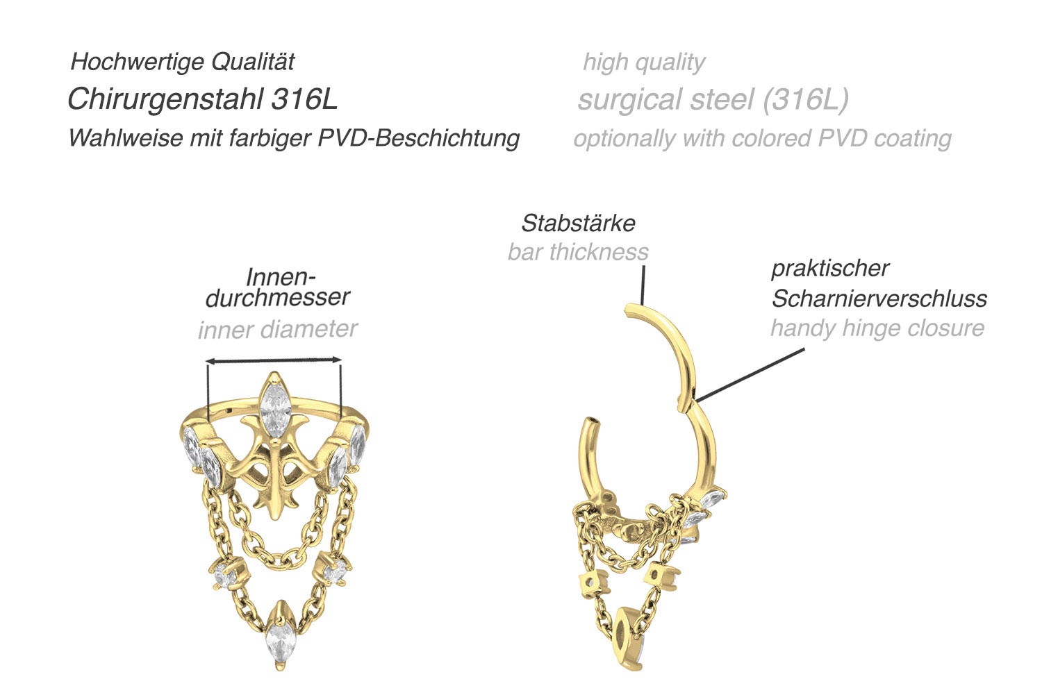 Easy handling and gorgeous design - that is what our clickers are all about! The main feature of the clickers is the practical hinge, which simplifies the insertion. The material used for manufacturing (surgical steel 316L) is characterized by its flat texture and high quality. Depending on the desired color the piercing is covered with a scratch-resistant PVD coating. A special highlight is the beautiful design with the sparkling crown, to which two chains are attached. Whether at the ear, the nose or the lip - our clickers are suitable for a variety of different piercing locations. This clicker has a bar thickness of 1.2 mm, while its available inner diameters are listed below.