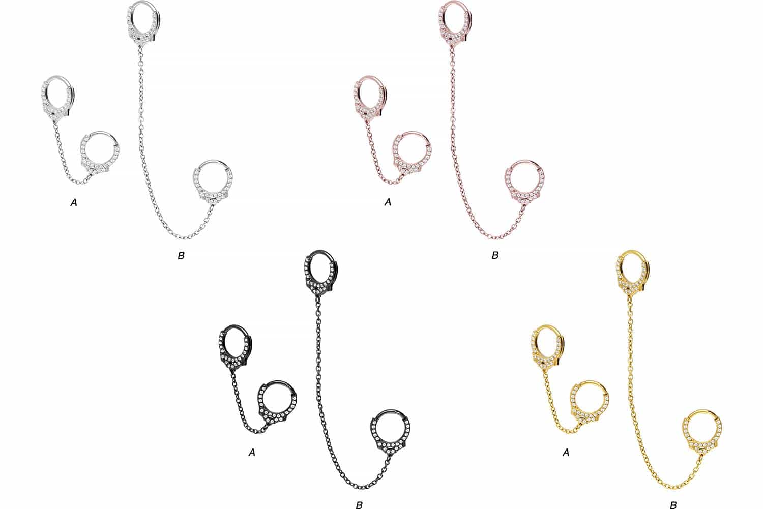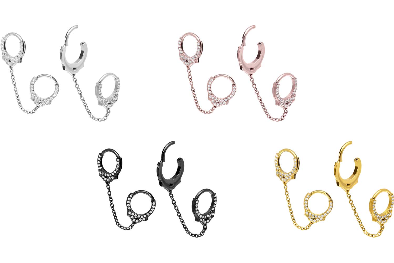 Easy handling and gorgeous design – that is what our clickers are all about! The main feature of the clickers is the practical hinge, which simplifies the insertion. The material used for manufacturing (surgical steel 316L) is characterized by its flat texture and high quality. Depending on the desired color the piercing is covered with a scratch-resistant PVD coating. In the case of this unique piece of jewelry, it is actually two clickers connected by a chain, whose appealing effect is achieved by means of their extravagant design in the form of handcuffs, additionally studded with sparkling crystals. They can be inserted either in two different piercing punctures, or in only one, depending on personal preference, so that one of the two handcuffs can dangle. Whether at the ear, the nose or the lip – our clickers are suitable for a variety of different piercing locations. These clickers have a bar thickness of 1.2 mm, while their available inner diameter is 8 mm.