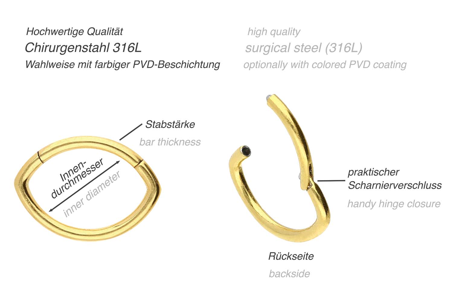 Easy handling and gorgeous design – that is what our clickers are all about! The main feature of the clickers is the practical hinge, which simplifies the piercing's insertion. The material used for manufacturing (surgical steel 316L) is characterized by its flatness and high quality. Depending on the desired color the piercing is covered with a scratch-resistant PVD coating. The extraordinary oval shape gives the piece of jewelry that certain something. Whether at the ear, the nose or the lip – our clickers are suitable for a variety of different piercing locations.Material: surgical steel 316L