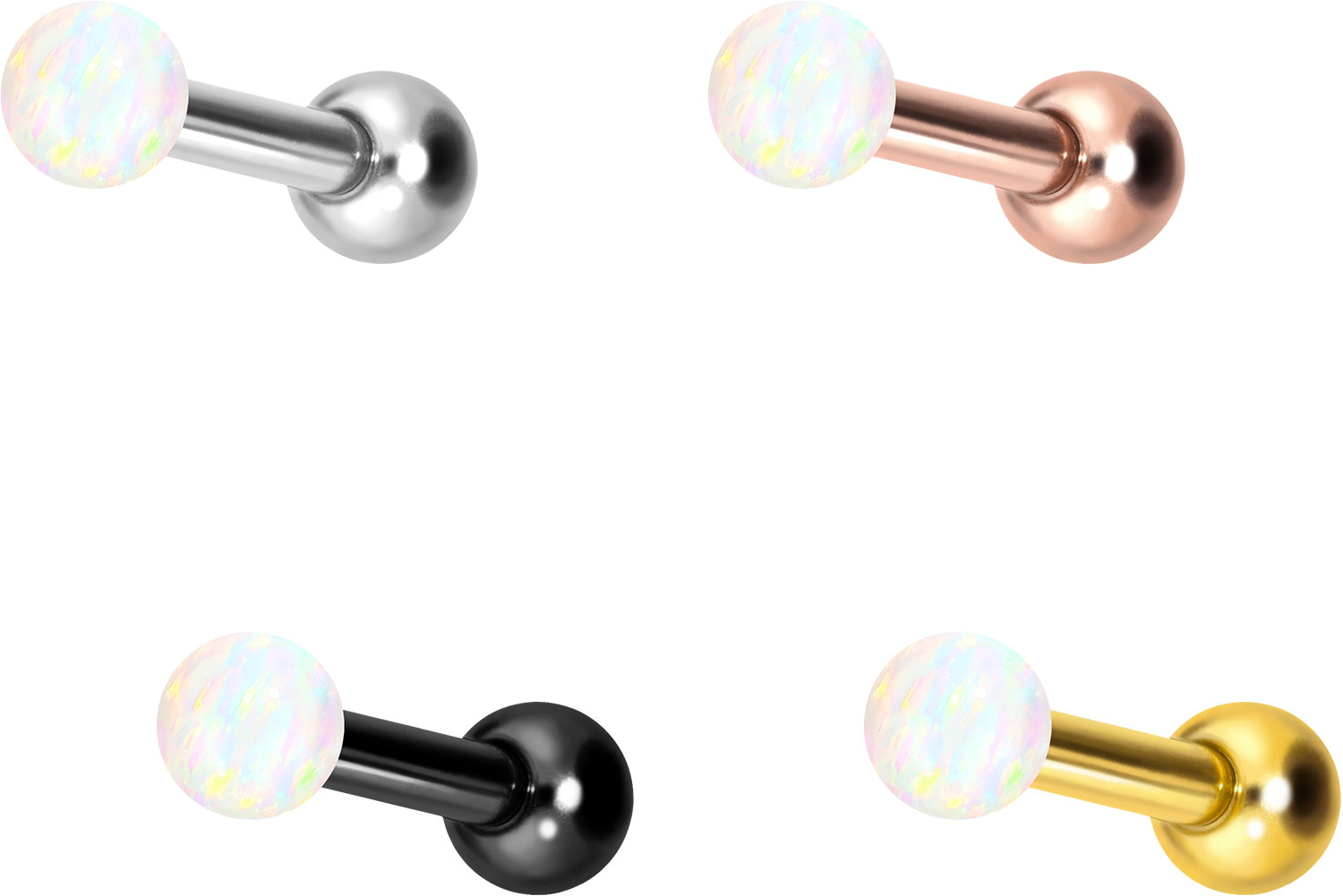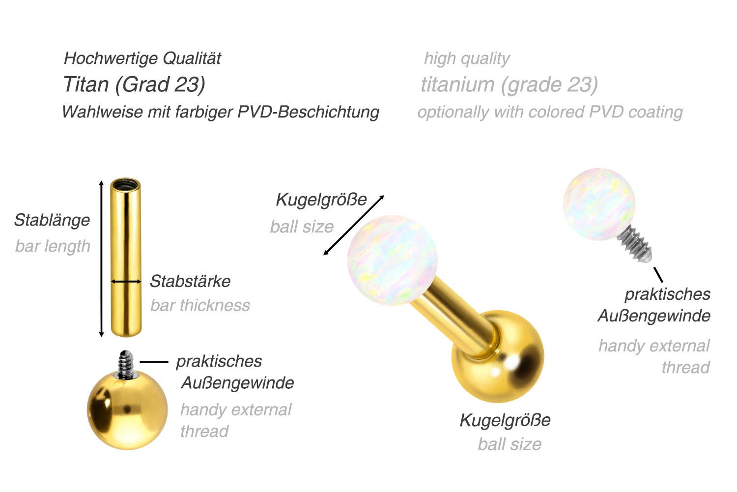 PVD-Beschichtung gewährleistet wird. Visuell überzeugt das Schmuckstück durch den zeitlos schönen Schraubaufsatz mit Außengewinde in Form eines synthetischen Opals. Das Ohrpiercing hat eine Stabstärke von 1,2 mm und ist mit einer Stablänge von entweder 6 oder 8 mm erhältlich. Darüber hinaus können sowohl der Aufsatz als auch die hintere 3 mm Kugel durch das 0,9 mm Innengewinde nach Belieben durch all unsere anderen Schraubaufsätze mit entsprechendem Außengewinde ausgetauscht werden.