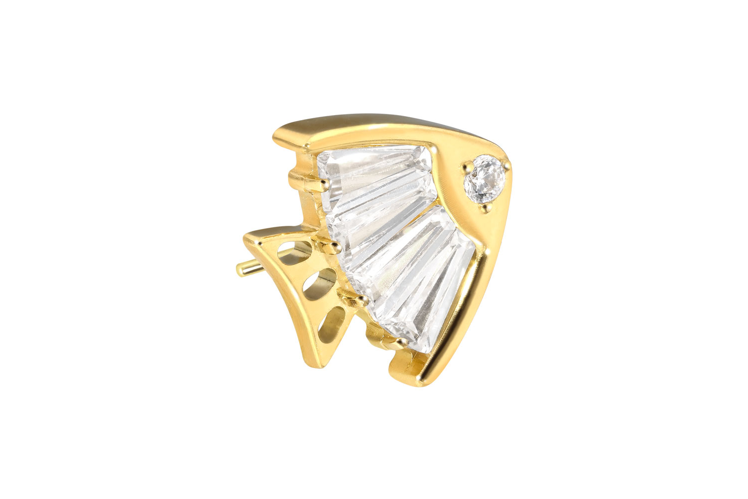 This unique push pin attachment in form of a crystal fish was specially developed for our push fit piercings and is made of high quality titanium, which among other advantages is characterized by good skin compatibility and high durability. Also one of its specific material properties is color fastness, guaranteed in the silver-colored variants as well as in the black, gold and rosegold-colored variants with PVD coating. For insertion, the pin must be bent as desired. It should be noted that a firmer hold is ensured when the pin is bent a little more. Since the push pin of the attachment is compatible with all our push fit products, there are furthermore various combination possibilities.