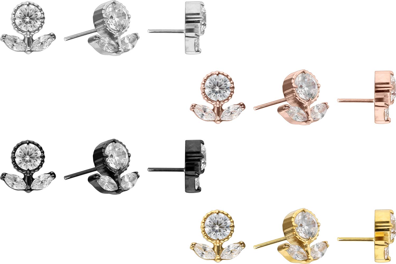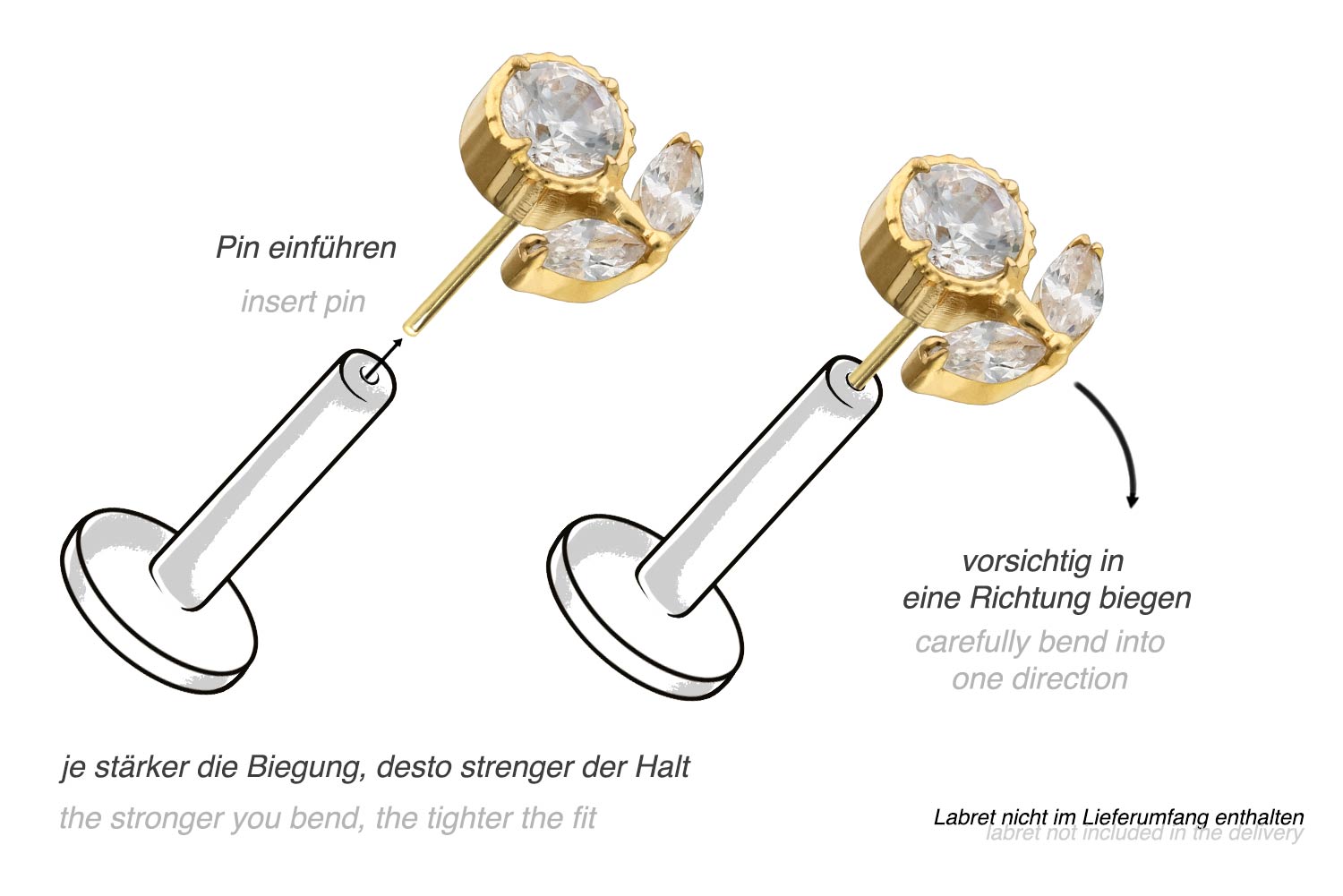 This unique push pin attachment in form of a crystal flower was specially developed for our push fit piercings and is made of high quality titanium, which among other advantages is characterized by good skin compatibility and high durability. Also one of its specific material properties is color fastness, guaranteed in the silver-colored variants as well as in the black, gold and rosegold-colored variants with PVD coating. For insertion, the pin must be bent as desired. It should be noted that a firmer hold is ensured when the pin is bent a little more. Since the push pin of the attachment is compatible with all our push fit products, there are furthermore various combination possibilities.