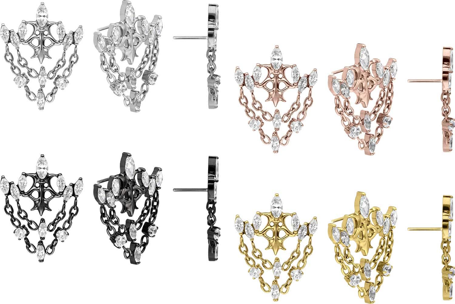 This unique push pin attachment in form of a gothic crown, combined with several chains, was specially developed for our push fit piercings and is made of high quality titanium, which among other advantages is characterized by good skin compatibility and high durability. Also one of its specific material properties is color fastness, guaranteed in the silver-colored variants as well as in the black, gold and rosegold-colored variants with PVD coating. For insertion, the pin must be bent as desired. It should be noted that a firmer hold is ensured when the pin is bent a little more. Since the push pin of the attachment is compatible with all our push fit products, there are furthermore various combination possibilities.