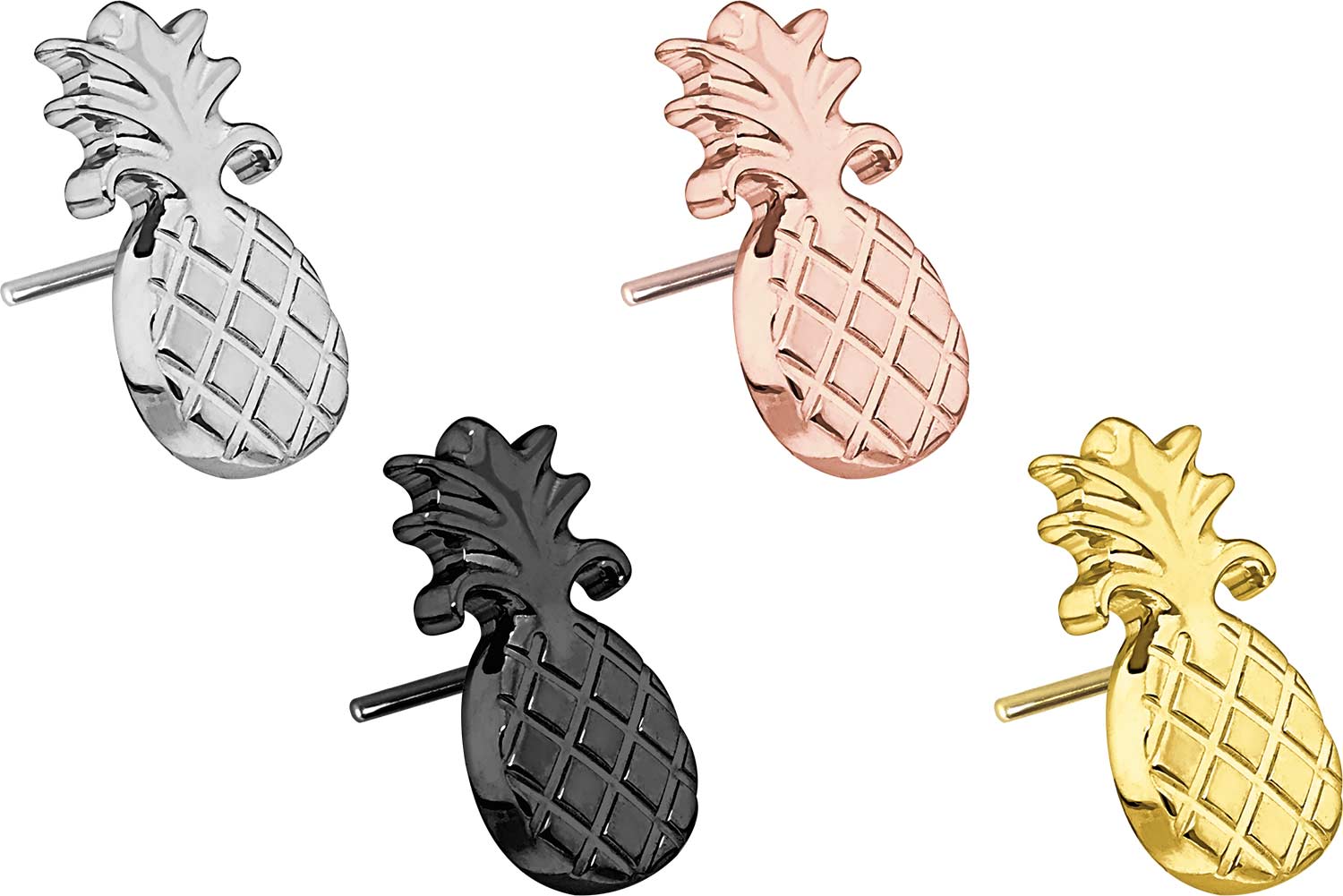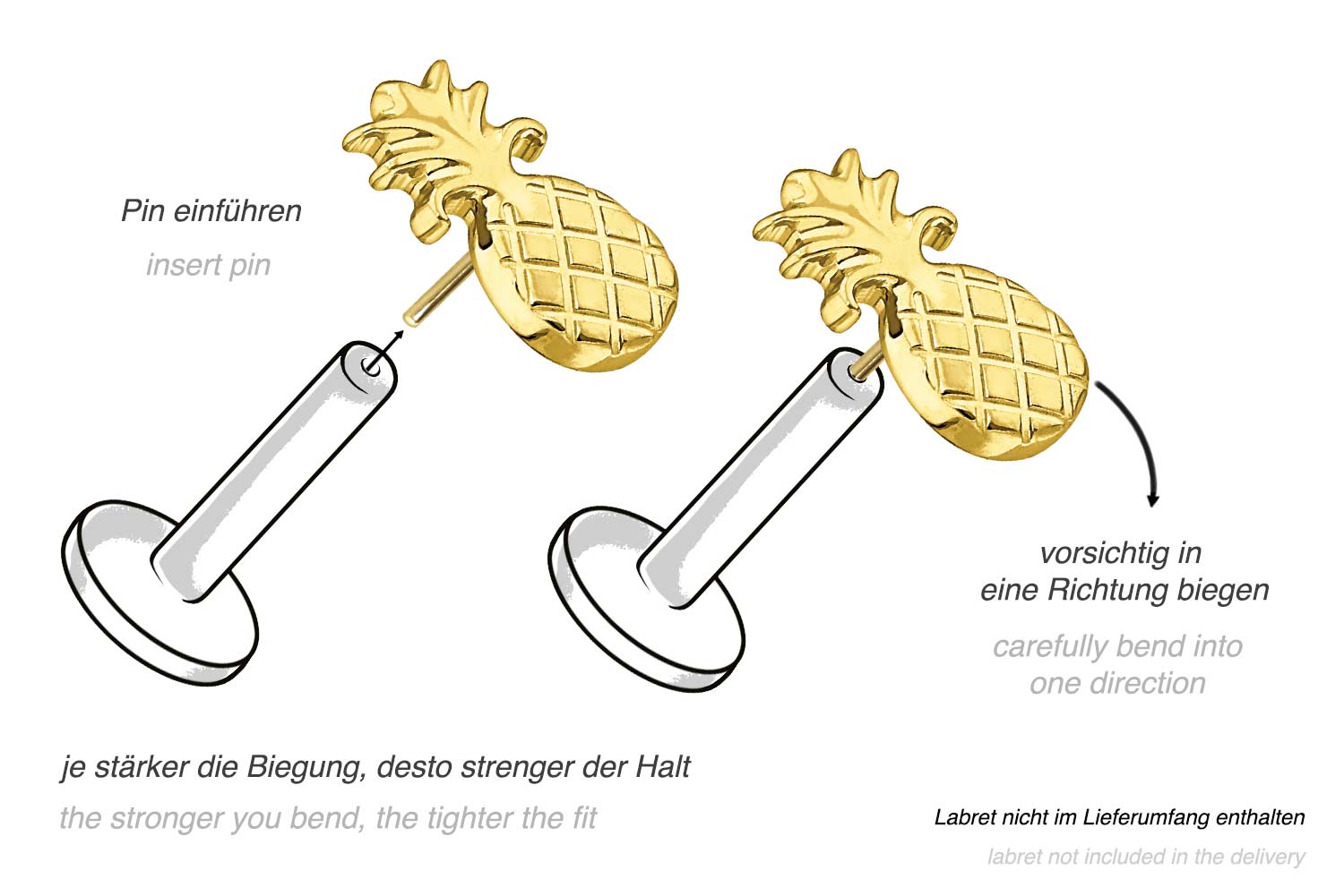 This unique push pin attachment in form of a pineapple was specially developed for our push fit piercings and is made of high quality titanium, which among other advantages is characterized by good skin compatibility and high durability. Also one of its specific material properties is color fastness, guaranteed in the silver-colored variants as well as in the black, gold and rosegold-colored variants with PVD coating. For insertion, the pin must be bent as desired. It should be noted that a firmer hold is ensured when the pin is bent a little more. Since the push pin of the attachment is compatible with all our push fit products, there are furthermore various combination possibilities.
