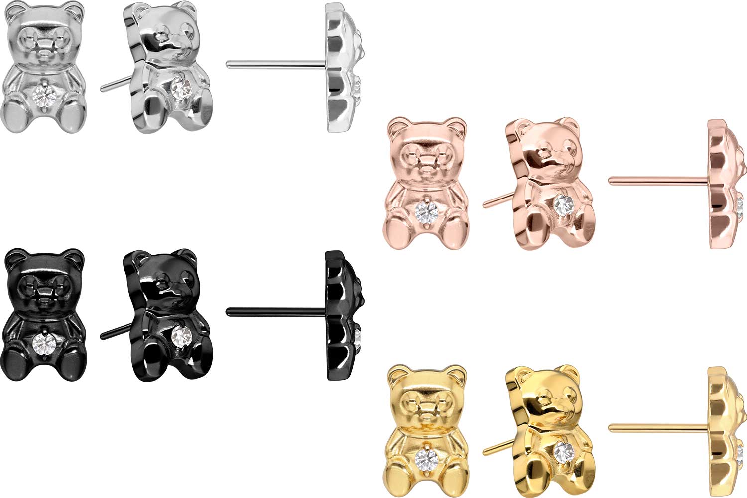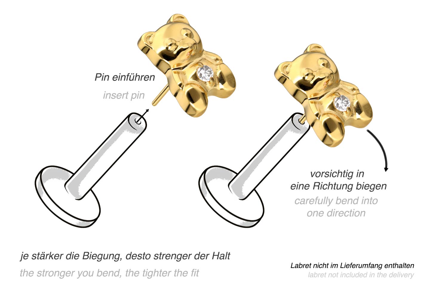 This unique push pin attachment in form of a teddy bear was specially developed for our push fit piercings and is made of high quality titanium, which among other advantages is characterized by good skin compatibility and high durability. Also one of its specific material properties is color fastness, guaranteed in the silver-colored variants as well as in the black, gold and rosegold-colored variants with PVD coating. For insertion, the pin must be bent as desired. It should be noted that a firmer hold is ensured when the pin is bent a little more. Since the push pin of the attachment is compatible with all our push fit products, there are furthermore various combination possibilities.