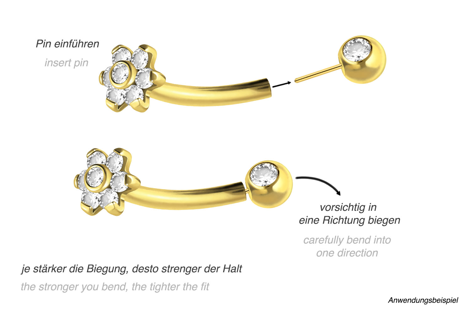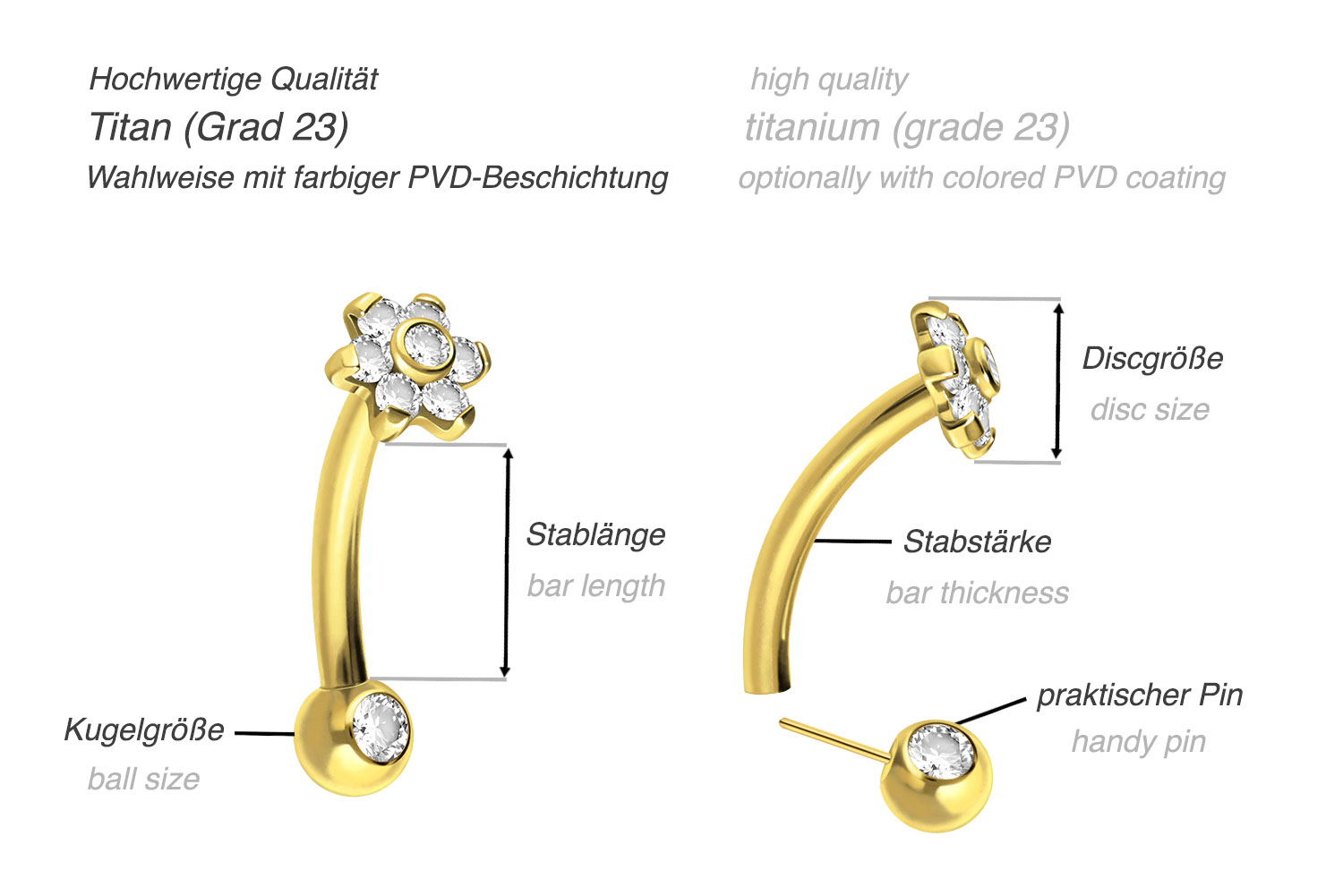 This beautiful banana is made of high quality titanium, which is also known for material properties such as particularly good skin compatibility and high durability. Another of its advantages is color fastness, also guaranteed in the colored versions with PVD coating. The crystal ball is attached to the piece of jewelry by using a push pin, while the design in form of a flower with another seven sparkling crystals, located on the opposite side, is firmly fixed to the bar. Due to the push fit technology used, the banana can be combined at will with all of our attachments with push pin.