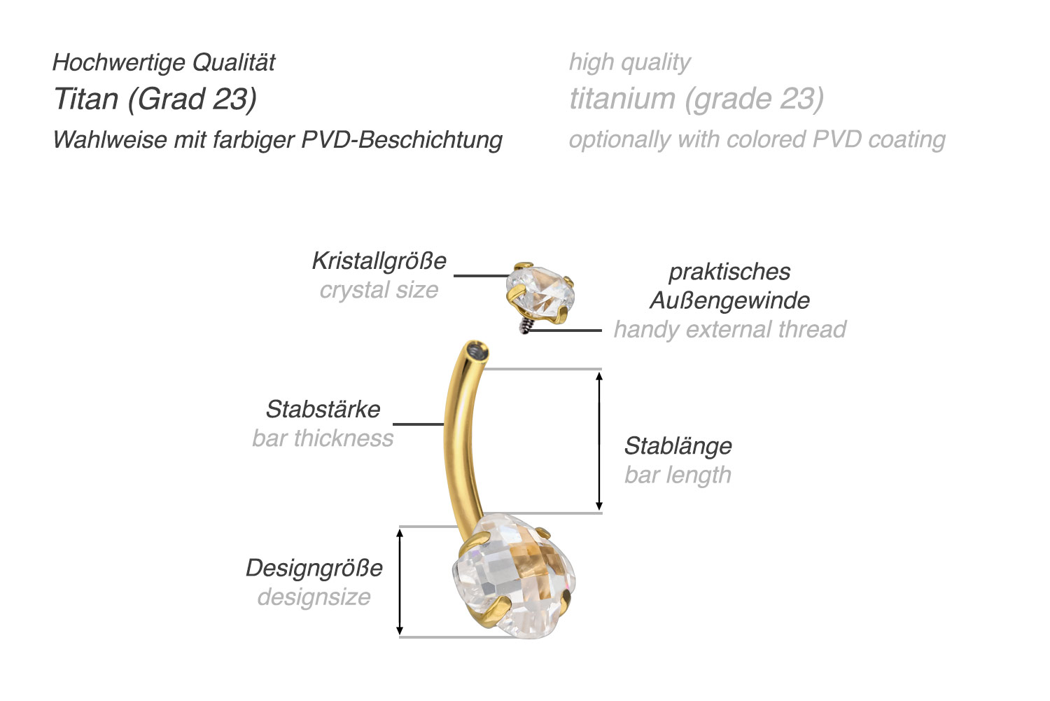 This bellybutton piercing is made of high quality titanium, whose specific material properties include particularly good skin compatibility and high durability. Another of its advantages is color fastness, also guaranteed in the colored variants with PVD coating. The design with the sparkling crystal flower is firmly connected to the bananabell, while the upper crystal can be unscrewed. This is thanks to the 0.9 mm external thread. As a counterpart, the bananabell has an equally thick internal thread, which can be combined at will with all our screw-in attachments with a corresponding external thread if required.